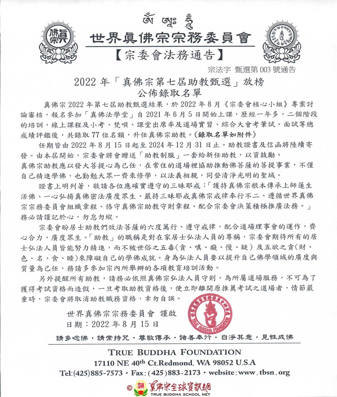 真佛宗2022年第七屆助教甄選結果,於2022年8月《宗委會核心小組》專案討論審核,報名參加「真佛法學堂」自2021年6月5日開始上課,歷經一年多,二個階段的培訓,線上課程及小考、梵唄、課堂出席率及道場實習、綜合大會考筆試、面試等總成績評鑑後,共錄取77位名額,升任真佛宗助教。(錄取名單如附件)