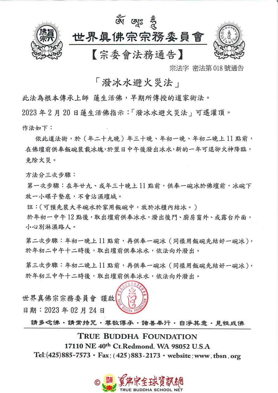 2023年2月20日蓮生活佛指示:「潑冰水避火災法」可遙灌頂。