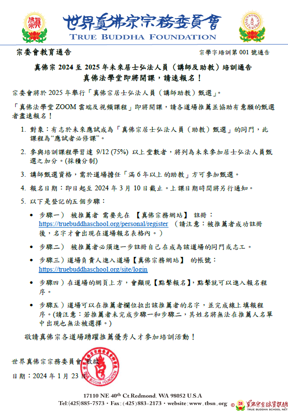真佛宗2024至2025年未來居士弘法人員(講師及助教)培訓通告