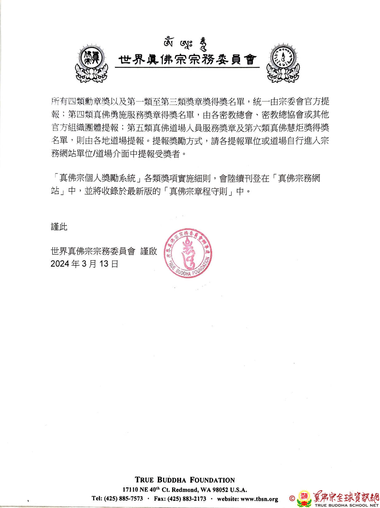 「真佛宗個人獎勵系統」各類獎項實施細則,會陸續刊登在「真佛宗務網站」中,並將收錄於最新版的「真佛宗章程守則」中。