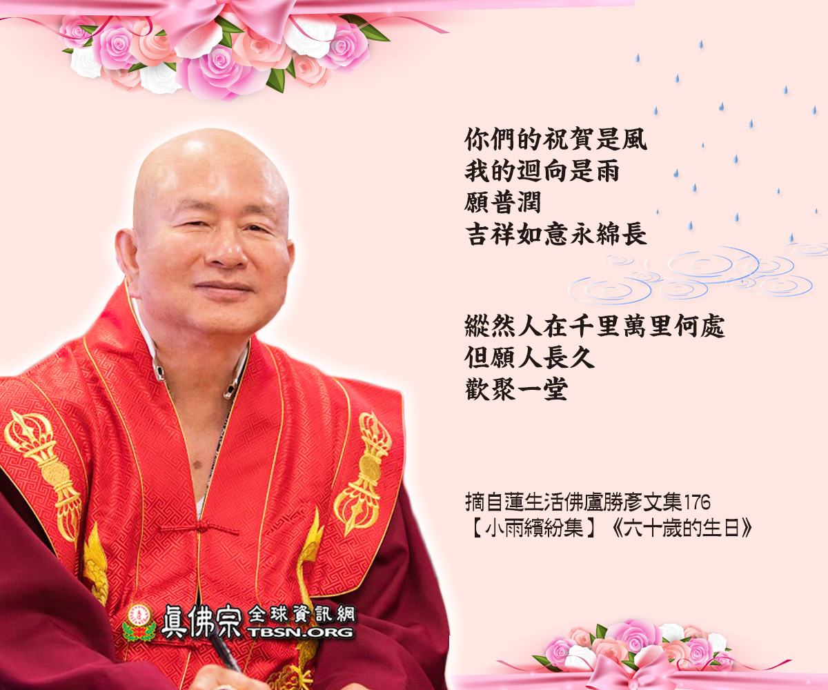 我當然知道,我的五百萬弟子,會在世界各國的雷藏寺、各國分堂、各國同修會,為我祝賀六十歲的生日大壽,也會祈求「長住世間、不入涅槃」。