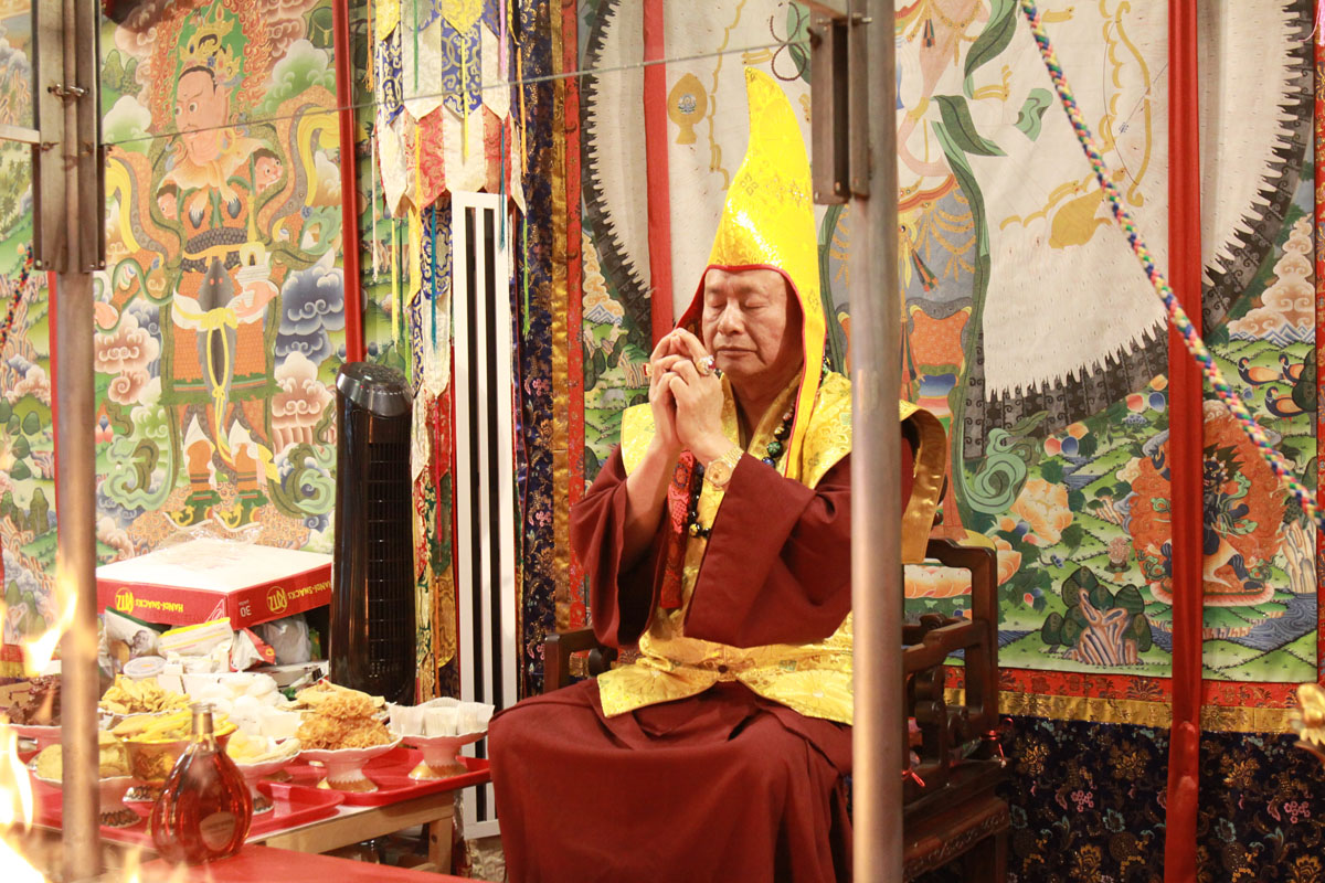 我們首先敬禮傳承祖師,敬禮了鳴和尚,敬禮薩迦證空上師,敬禮十六世大寶法王噶瑪巴,敬禮吐登達爾吉上師,敬禮壇城諸尊,敬禮三寶,敬禮護摩主尊「愛染明王」。