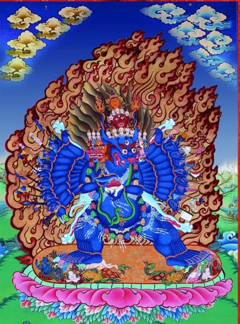 「大威德金剛」是阿彌陀佛的教令輪,又稱為「吉杰多傑」,是五方佛化身為五大金剛, 文殊師利菩薩的化身,又名「怖畏金剛」、「威德金剛」,其梵名是「閻曼 德迦」(Yamantaka),即是降伏諸魔之意義也,其名稱是「敵治死亡」、「聖閻曼德迦威怒王」、「降伏閻魔尊」等等之名稱。此尊在胎藏界的曼荼羅 內,是位于持明院中般若菩薩的左側。