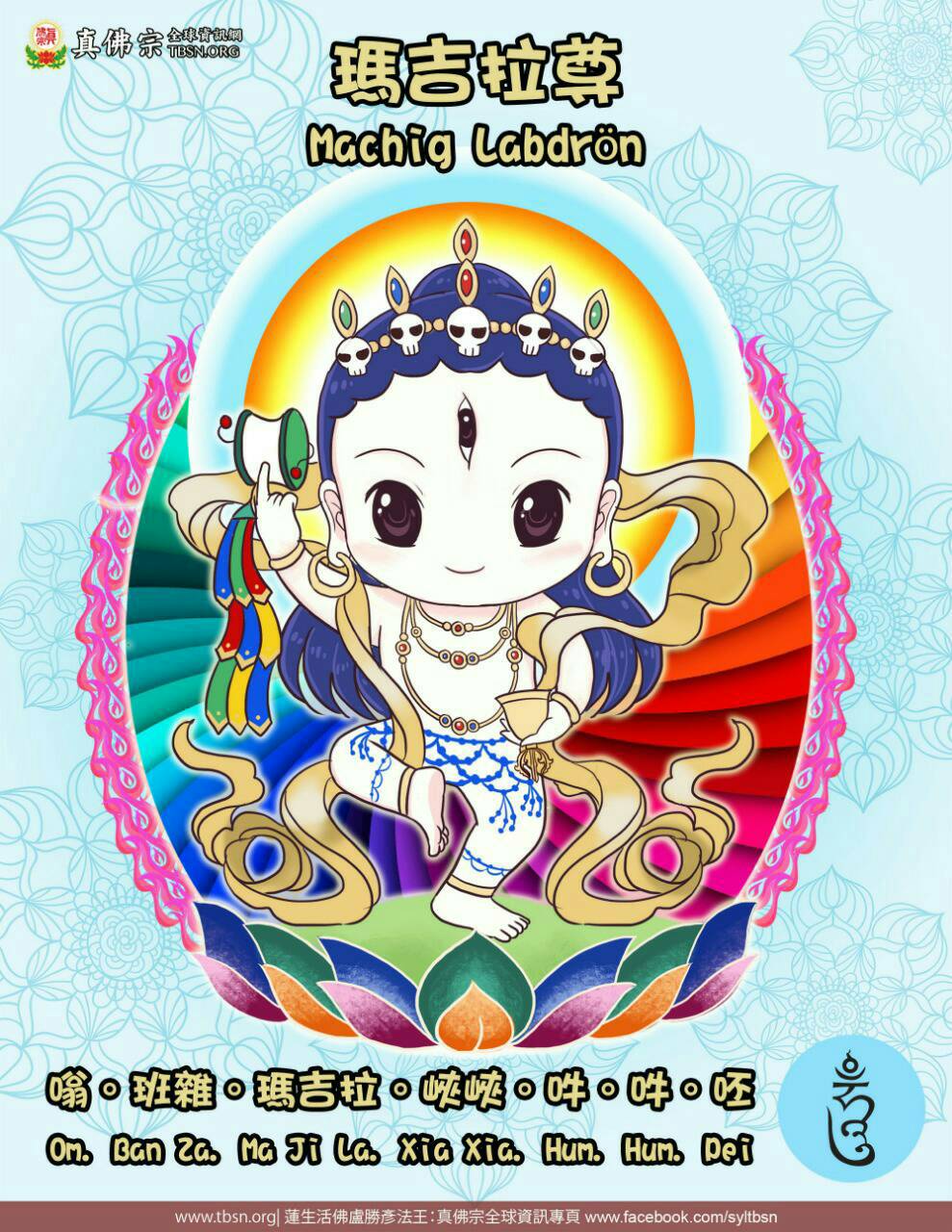 西藏密宗捨身法的創始者。怎麼捨?兩個眼睛化為宇宙的日月,你身體的皮化為宇宙的大地,那些骨跟肉化為宇宙的塵土跟山,河流就是你身上的血,湖泊海洋河流,都是你身上的血去化成的,你的呼吸就化為風,你身上的這些毛就化為大地的樹,祂是做這樣子觀想,把你身上的一切,包括你自己,全部割捨給所有的眾生,這是覺宇派祖師,瑪吉拉尊者本身捨身法的一個大意。