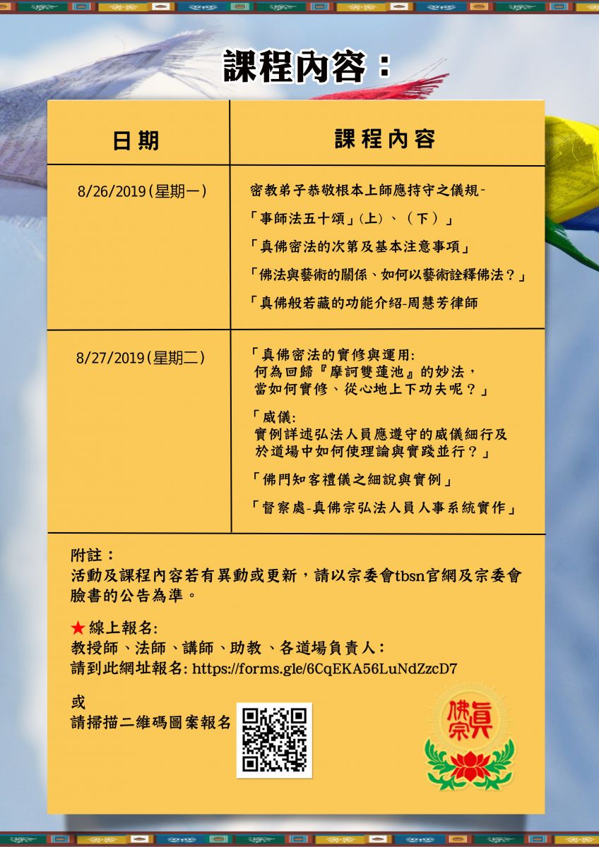 8/27/2019 (星期二) | 「真佛密法的實修與運用: 何為回歸『摩訶雙蓮池』的妙法,當如何實修、 從心地上下功夫呢?」 「威儀: 實例詳述弘法人員應遵守的威儀細行及 於道場中如何使理論與實踐並行?」 「佛門知客禮儀之細說與實例」 「督察處-真佛宗弘法人員人事系統實作」 |