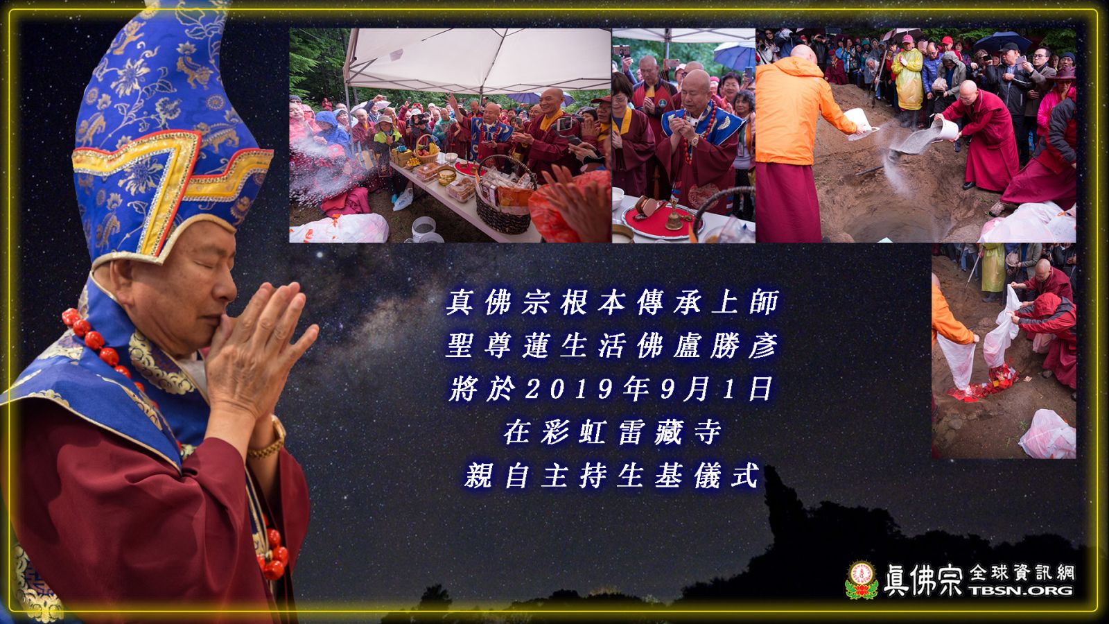 真佛宗根本傳承上師聖尊蓮生活佛盧勝彥將於2019年9月1日在彩虹雷藏寺親自主持生基儀式