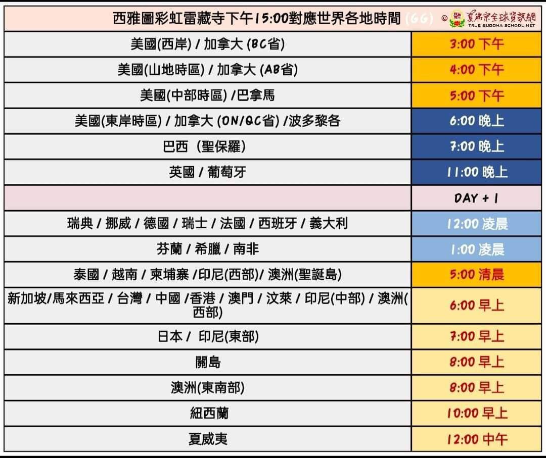 溫馨提醒:紐澳調時,西雅圖雷藏寺和彩虹雷藏寺同修法會世界對照時間表已更改