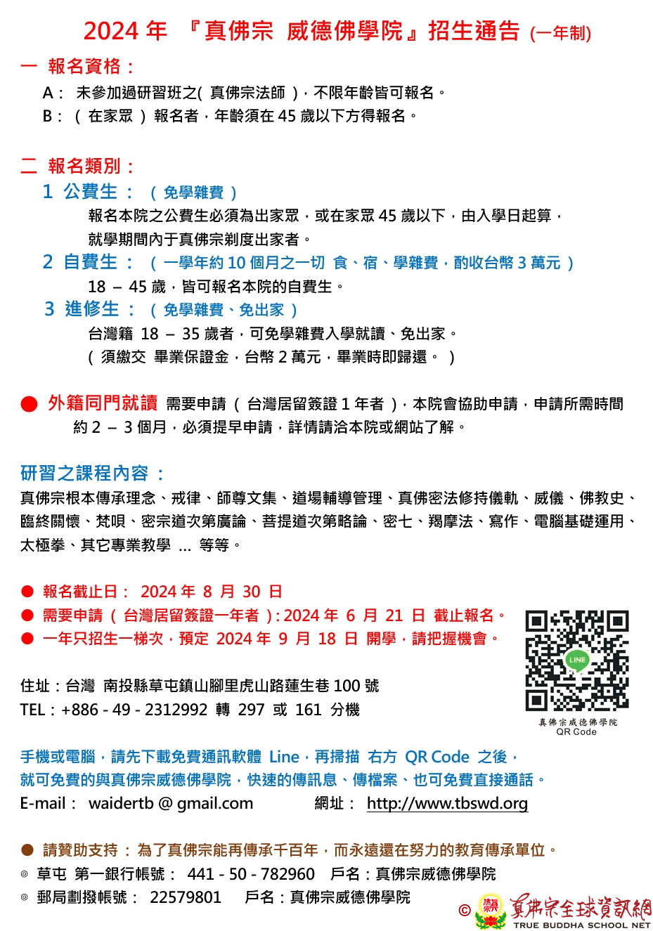 2024年 『真佛宗 威德佛學院』招生通告 (一年制)