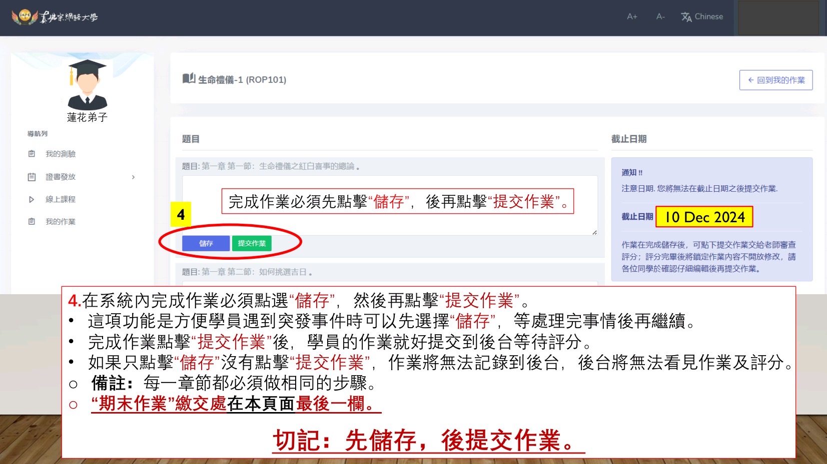 (所有作業學員需自己提交到真佛網絡大學內,逾期提交之作業將不受理)