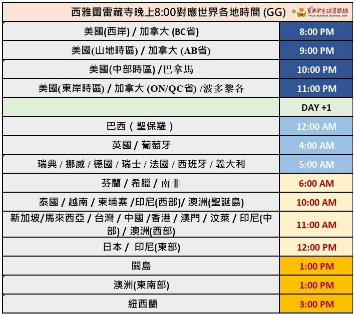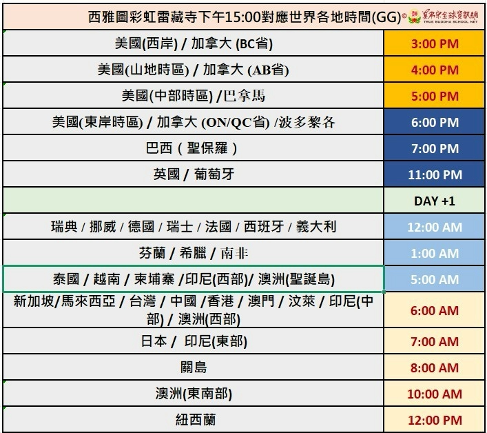 溫馨提醒:紐澳調時,西雅圖雷藏寺和彩虹雷藏寺同修法會世界對照時間表更換