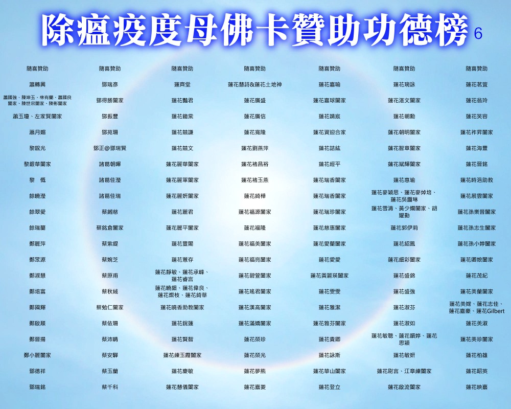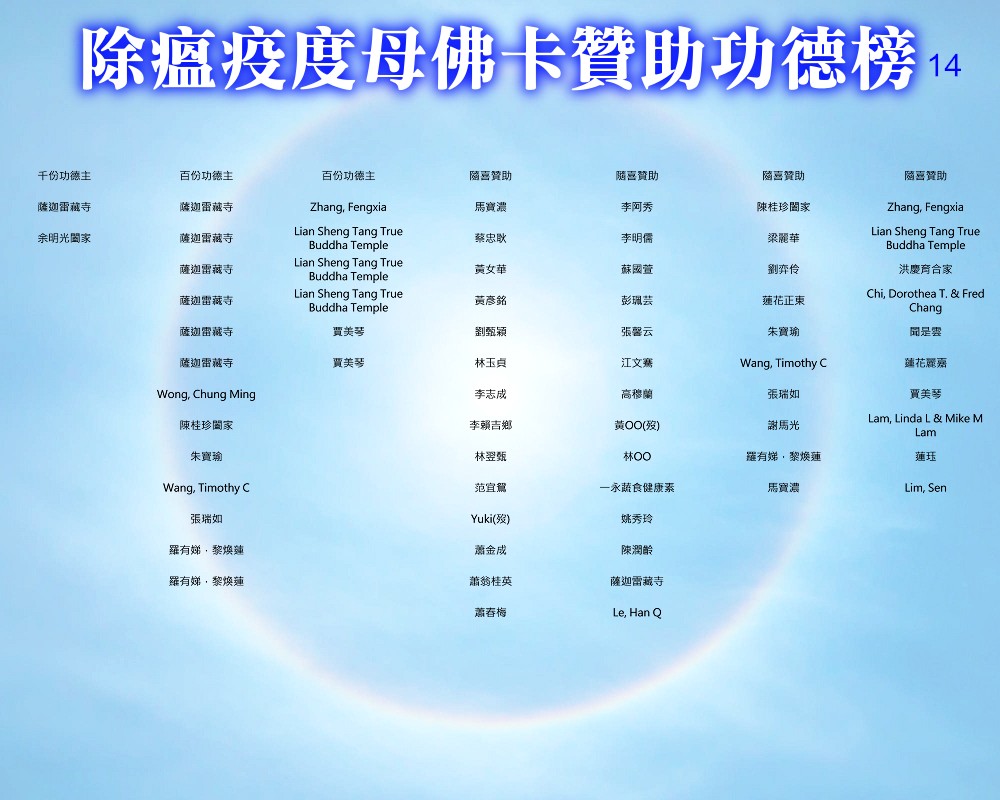 【除瘟疫度母佛卡贊助功德榜】 宗委會感恩諸位善信大德贊助印製「除瘟疫度母」佛卡! 在人心惶惶的疫情中,經由真佛宗根本傳承上師加持的「除瘟疫度母」佛卡令人倍增信心,卡中的「避疫病符」令人安心。持誦除瘟疫度母心咒或修除瘟疫度母念誦法時,法相更有助於觀想。 一張佛卡不僅是一張佛卡,祂既充滿了傳承加持力,充滿了師佛對弟子的疼惜和關懷,也滿載著功德主們的愛心。 宗委會再次對眾功德主表達衷心的感謝!功德無量!利益眾生! 世界真佛宗宗務委員會 合十