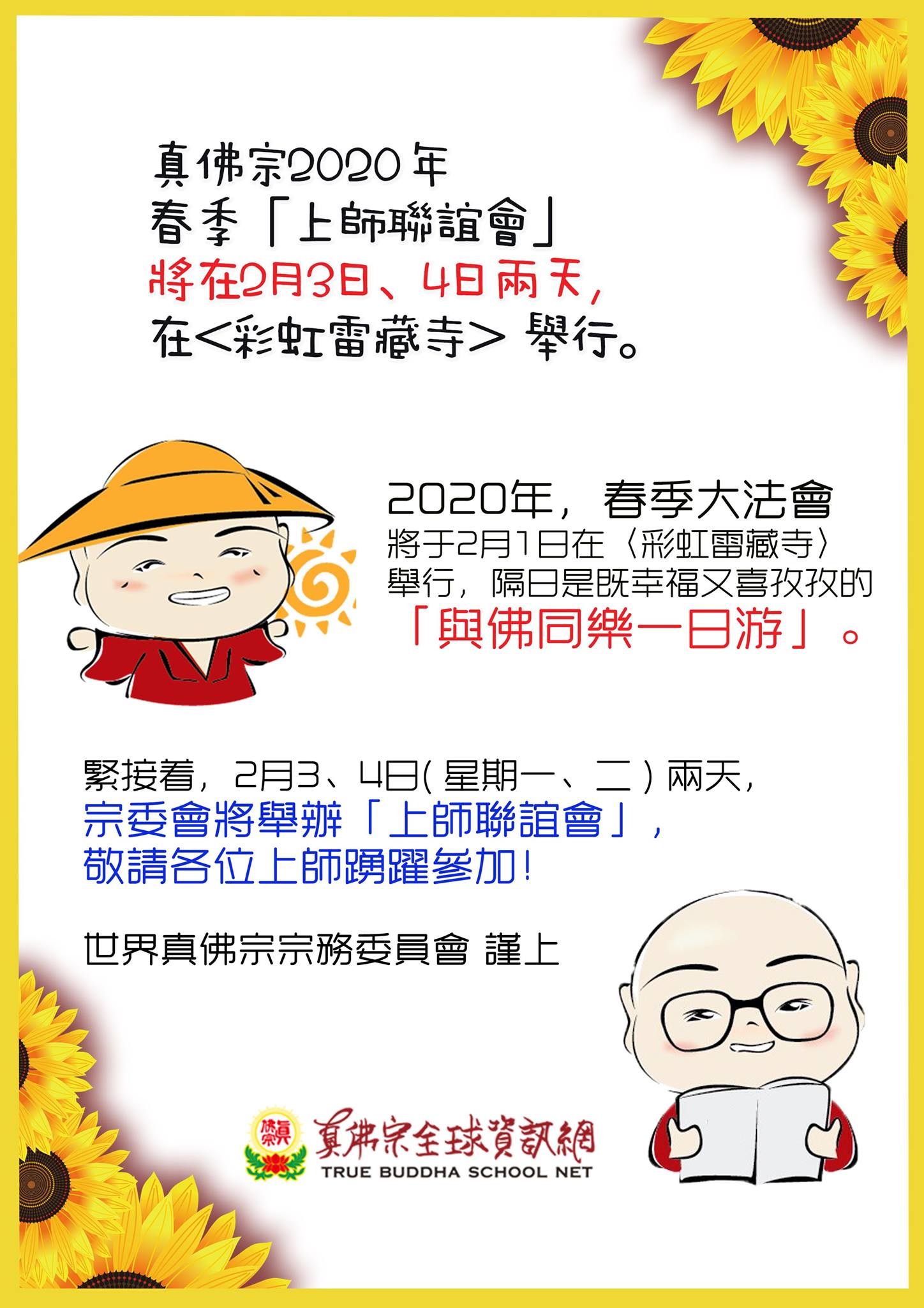 緊接著,2月3、4日( 星期ㄧ、二 ) 兩天,宗委會將舉辦「上師聯誼會」,敬請各位上師踴躍參加!