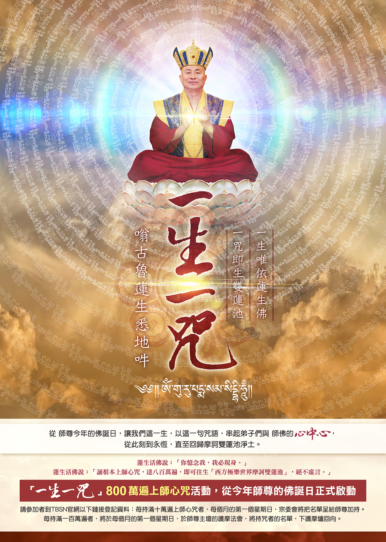 宗委會與眾弟子在這一天呈上「一生一咒」為獻禮,願每一天以蓮花童子心咒呼喚師尊,直至回歸摩訶雙蓮池淨土!