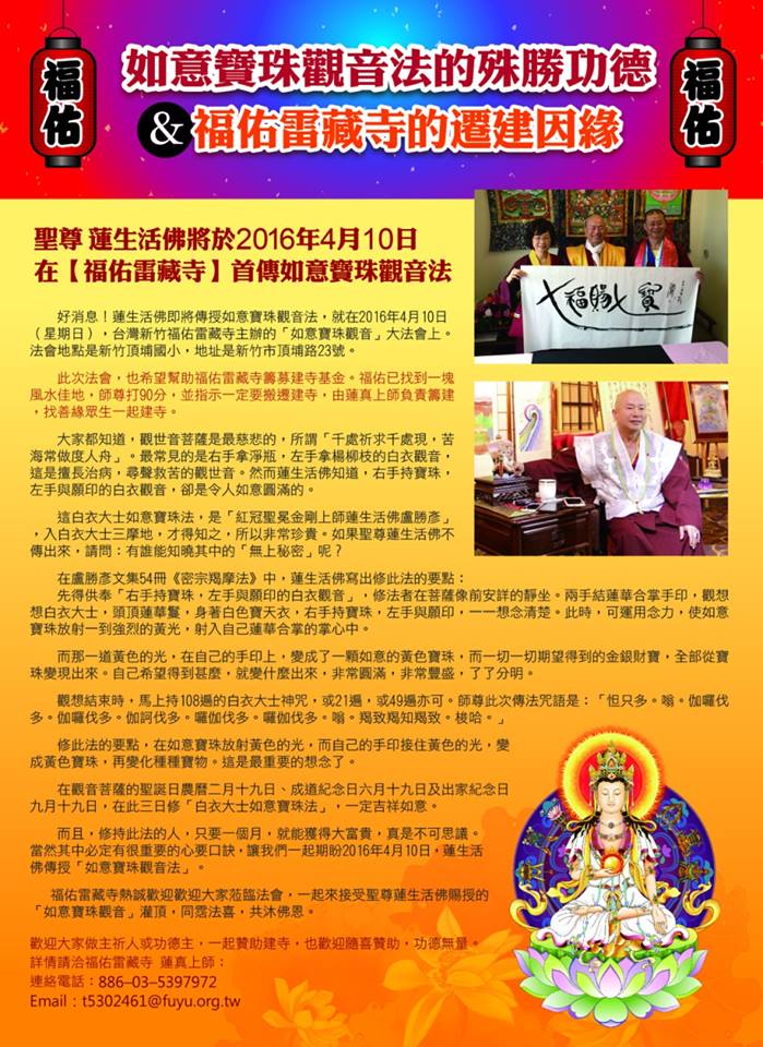 聖尊蓮生活佛將於2016年4月10日 在福佑雷藏寺首傳「如意寶珠觀音法」
