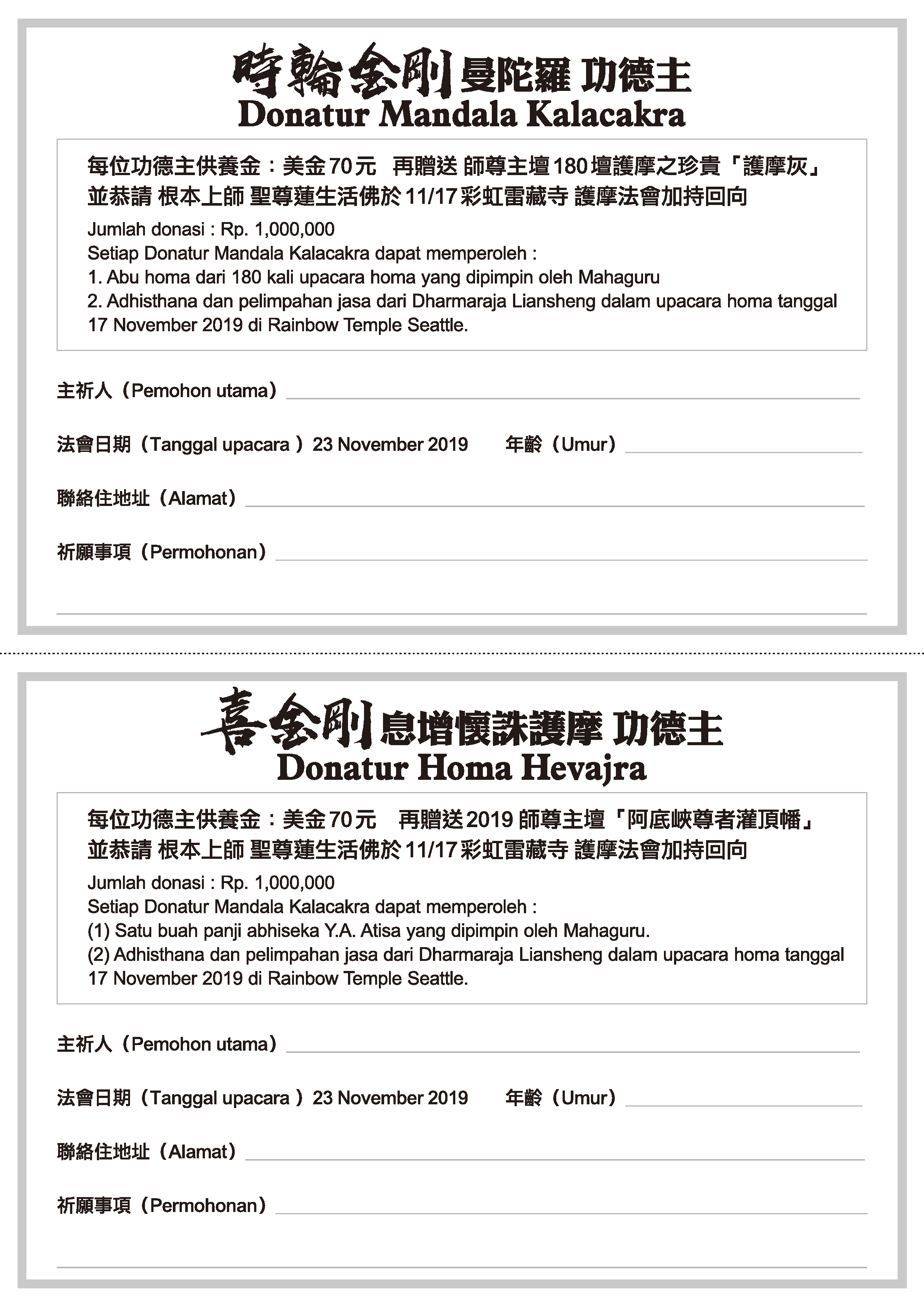 宗委會為此次印尼時輪金剛的活動,特別主祈,祈請根本上師 蓮生活佛10月20日在彩虹雷藏寺主壇「時輪金剛護摩火供」,大力加持印尼真佛宗時輪金剛大法與宗教學術交流活動吉祥圓滿,並加持所有贊助活動的功德主,正式轉動印尼真佛宗時輪金剛大法與宗教學術交流活動的起點!
