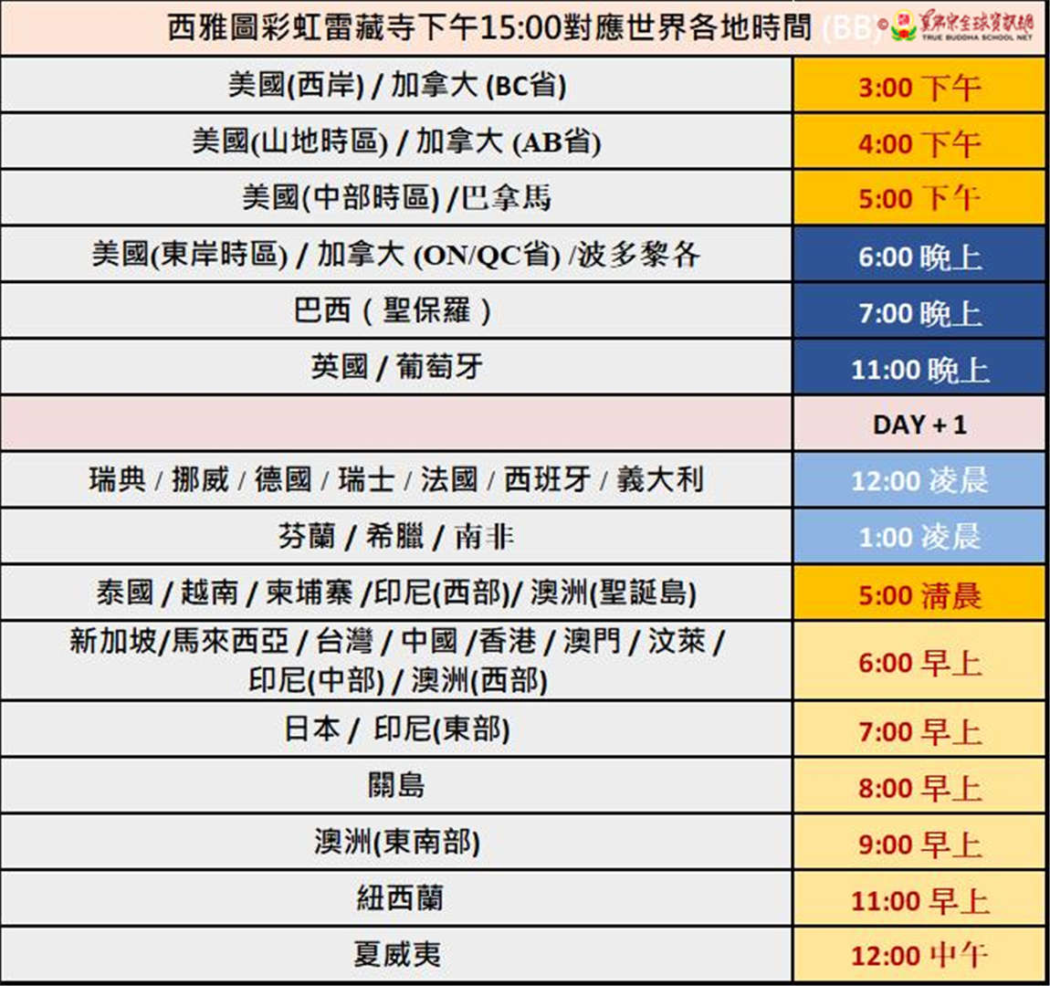 2022-10-02 #澳洲調時,西雅圖雷藏寺週六同修和彩虹雷藏寺週日護摩法會世界時間對照表更換
