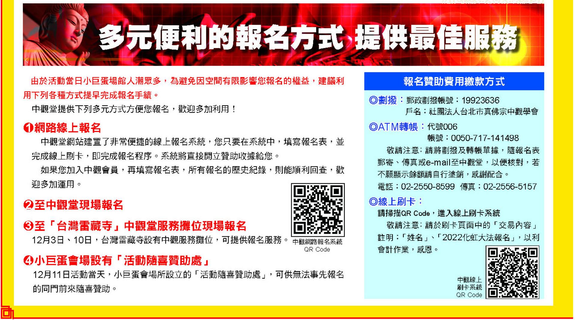 化虹大法法義、主祈功德主方案、報名方式、館場示意圖,請詳見《中觀雜誌》「化虹大法專刊」