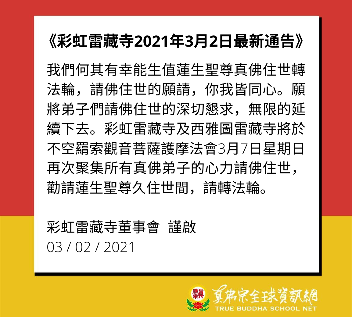 日期:2021/03/03 地點:彩虹雷藏寺 09:00(台灣時間)