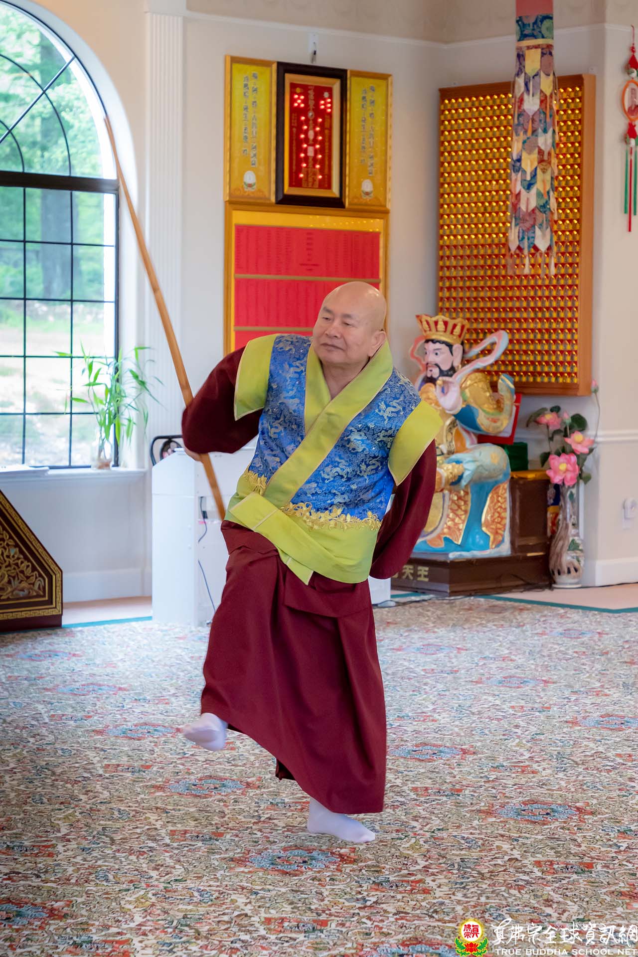 大殿的表演節目雖然不多,但各個卯足了勁,以呈現最好的表現給師尊師母觀賞。一位常住上師演唱一首《青藏高原》,不但高音飆上去,最後餘音迴旋不絕,中氣十足,博得師尊師母的喝采。一位協助直播的師姐表演現代舞蹈,曲名《Dancing With Your Ghost;譯:舞魅》,一身黑色纖細的短裙舞衣,婀娜多姿,體輕如風,舞姿曼妙如蝴蝶般飛舞,令人驚艷,也一樣贏得熱烈掌聲。而師尊壓軸的金剛棍,以精湛的功夫,技驚四座,獲得全場人員的歡呼聲。休息時間,師尊詢問該師姐如何學習舞蹈,得知原來師姐是看影片自練自學,真是不簡單。師尊聽到舞魅的曲名,馬上連想到一種舞風叫做「靈魂舞Soul Dance」,是起源於60、70年代,當時黑人的音樂及舞蹈上常用靈魂Soul一詞來表達他們的情緒。師尊說,許多原住民,天生都是擅長歌舞。而眾所皆知,師尊年輕時,也是舞林高手,對各種舞步的拍子和節奏,都能駕輕就熟。對師尊各方面學識廣博,大家都深感欽佩,師尊只淡淡說:「密教行者尤其是為師的,要甚麼都懂,要有足夠的歷練,千錘百鍊而不退,能不動心,才能經的起考驗。」