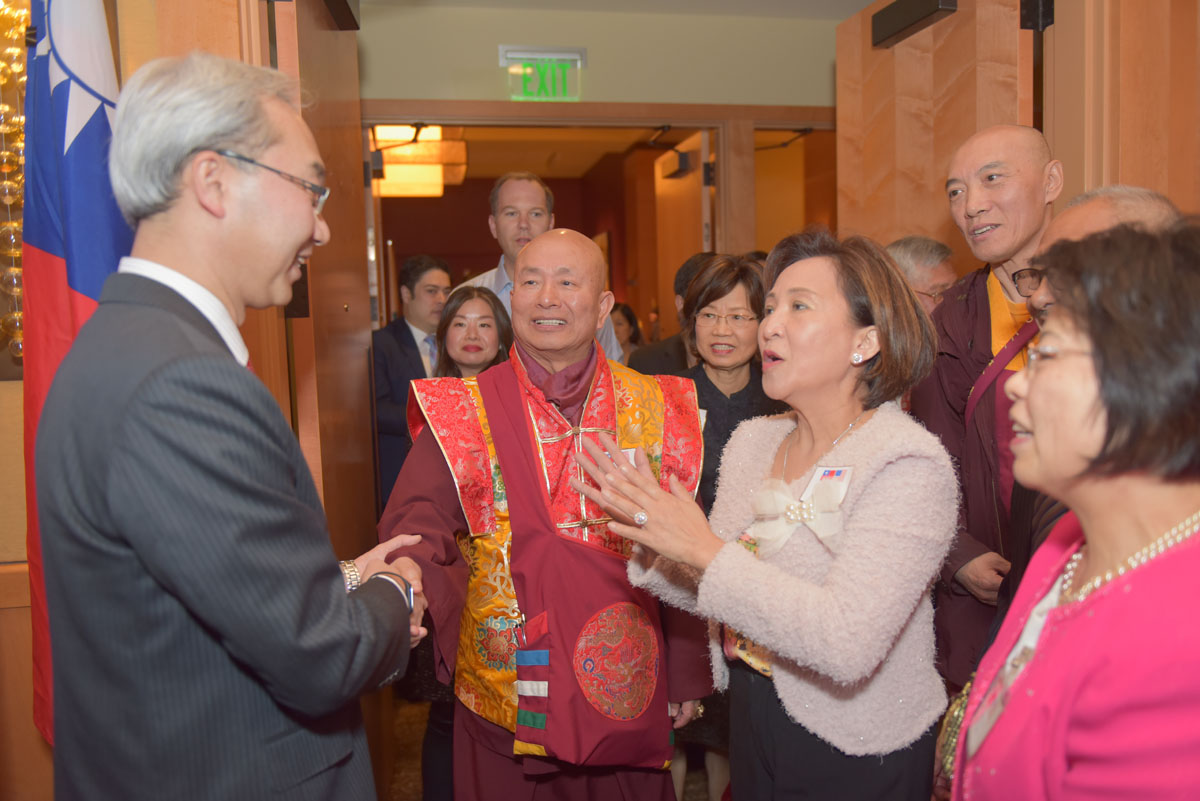 值得一提的是法王蓮生活佛盧勝彥與師母蓮香上師應邀出席,酒會在醒獅團表演下揭開序幕,法王蓮生活佛盧勝彥與甫抵任履新之駐西雅圖辦事處姚金祥處長在祥獅獻瑞下共同以『國泰民安 風調雨順』賀詞,慶賀中華民國生日快樂!