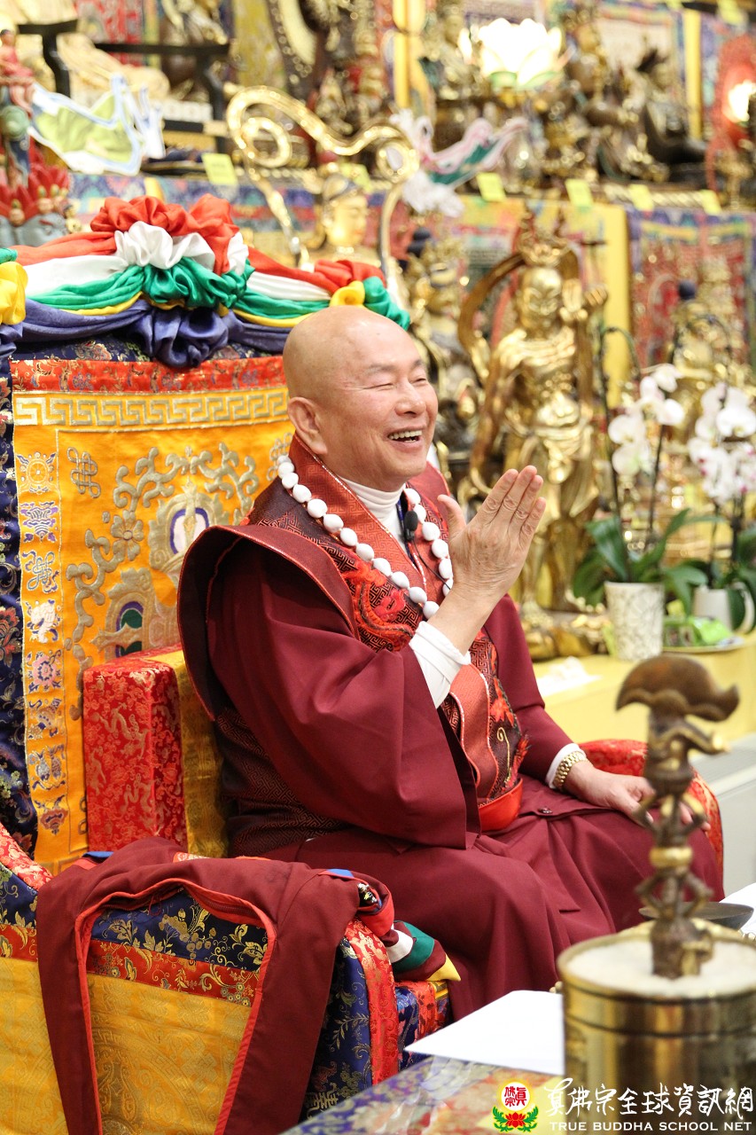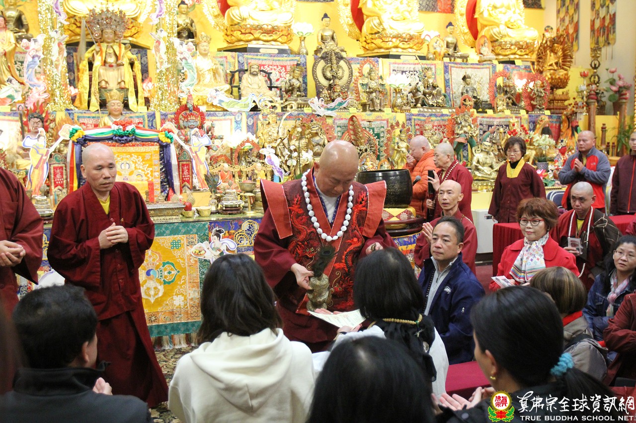 會後,聖尊為大眾賜授受皈依灌頂、加持大悲咒水及開光佛像。離廟前,聖尊為與會善信一一摩頂加持滿願。聖尊圓滿通達密法,完完全全了然於心,所以能精確闡釋深奧的道果法義,深入淺出的教導弟子們。一心禮敬根本傳承上師。