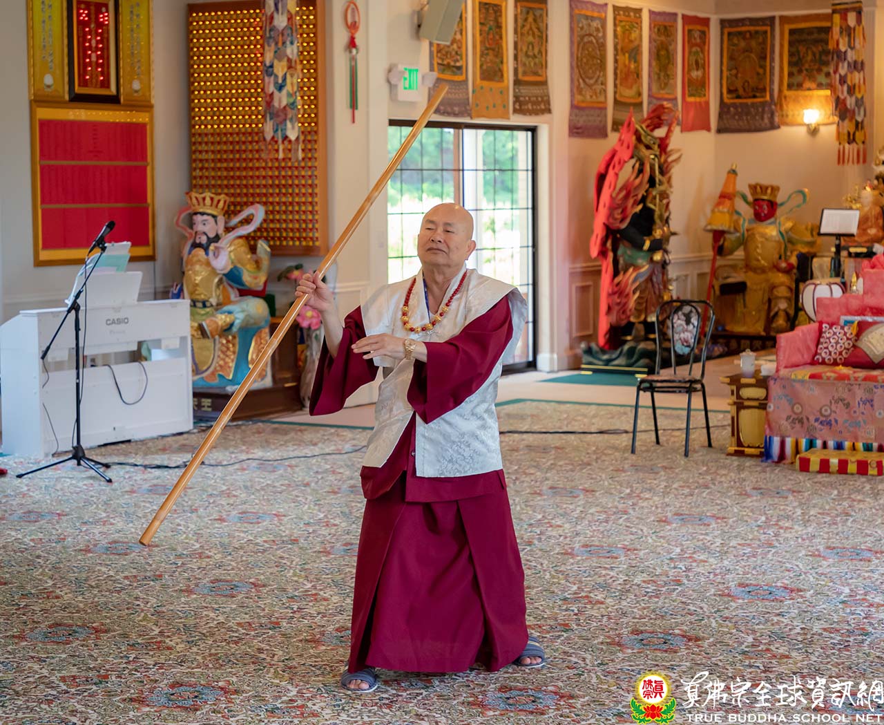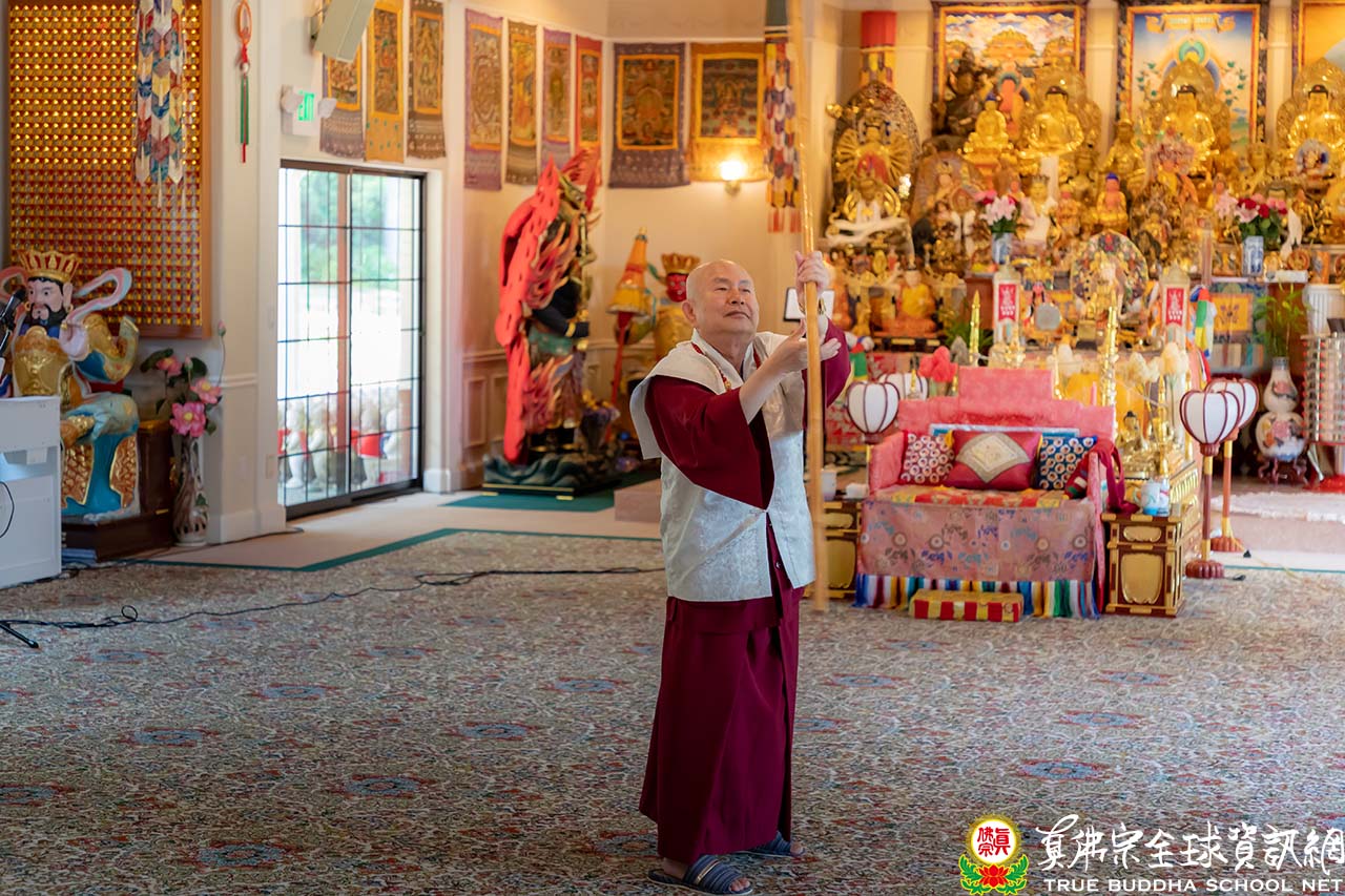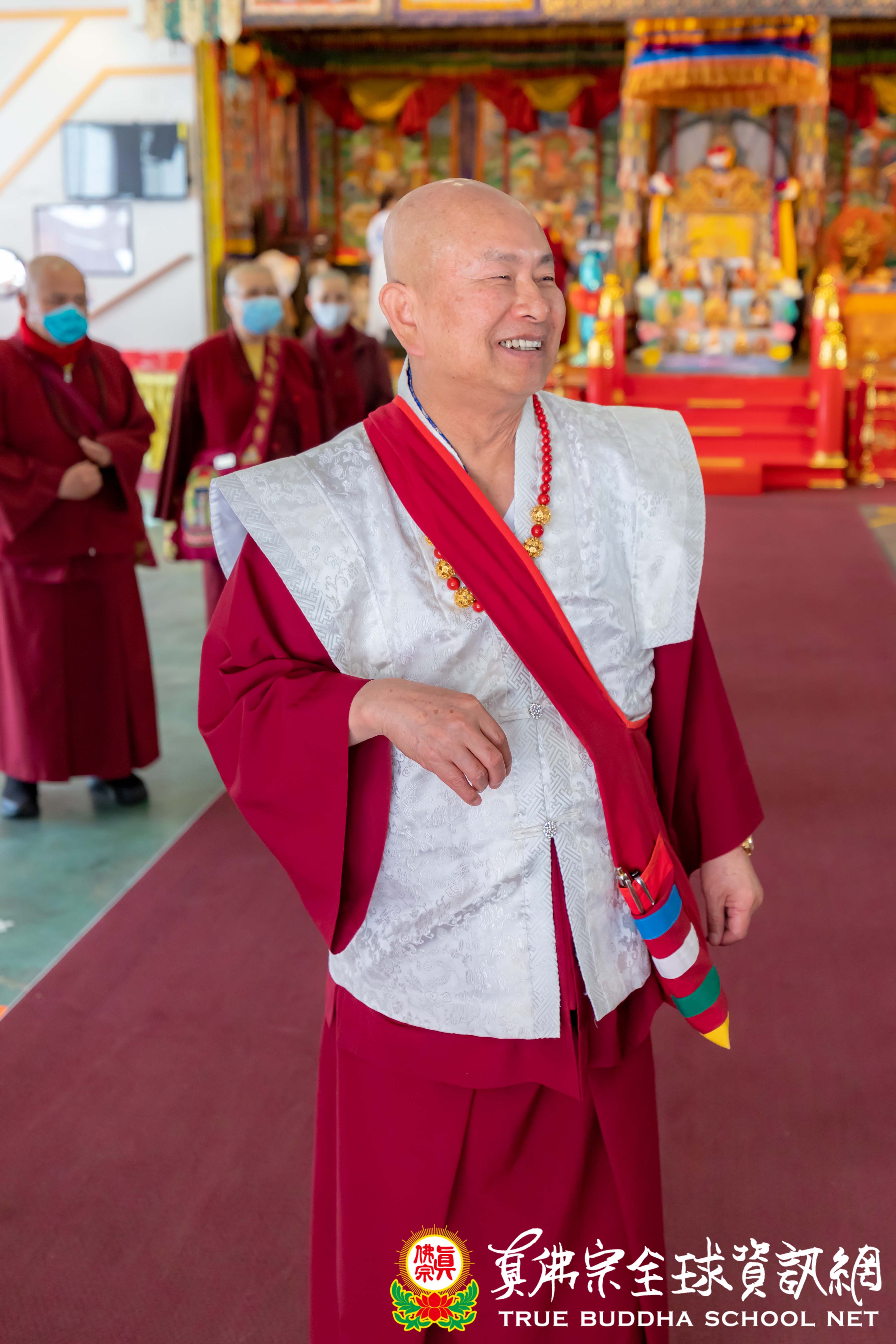 快接近午餐時分,遠見師尊、師母的坐車抵達山莊,數位出家僧眾到大門口迎接師尊、師母的到來。進到大殿之後,師尊帶領大家一起禮佛,師尊氣宇軒昂,動作標準的做著大禮拜,其體能之好,在場無人能夠比擬。