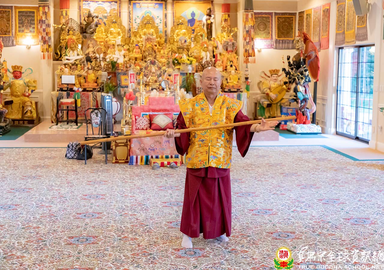 護摩結束後,大家一起跪拜頂禮感謝師尊主壇護摩法會的辛勞,師尊也帶領大眾過火。回到大殿,師尊、師母共同觀賞同門的賣力表演,最後師尊以一套快速勇猛、虎虎生風的金剛棍加持大家,在舞動如飛的棍影中,勁力纏綿不斷,棍法變化多端,讓大家為之驚嘆。