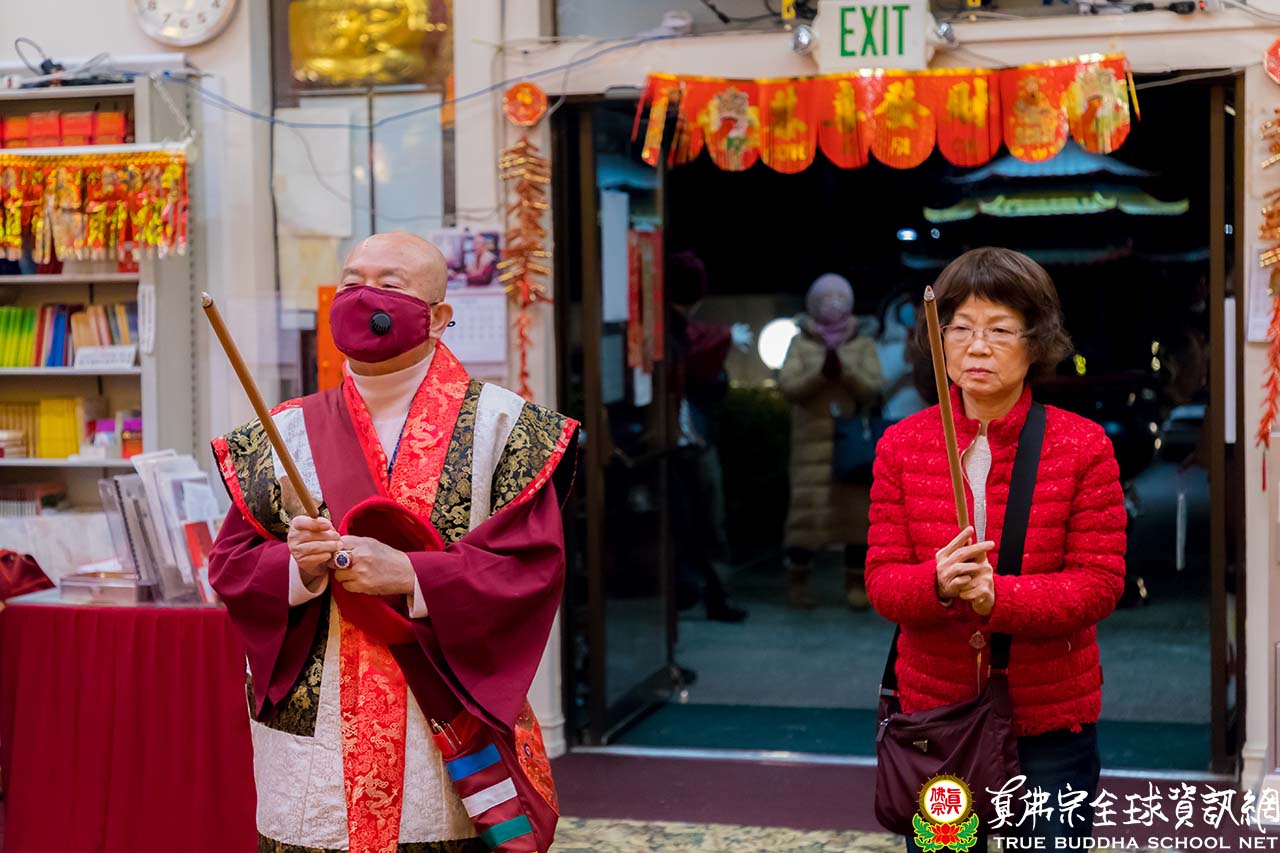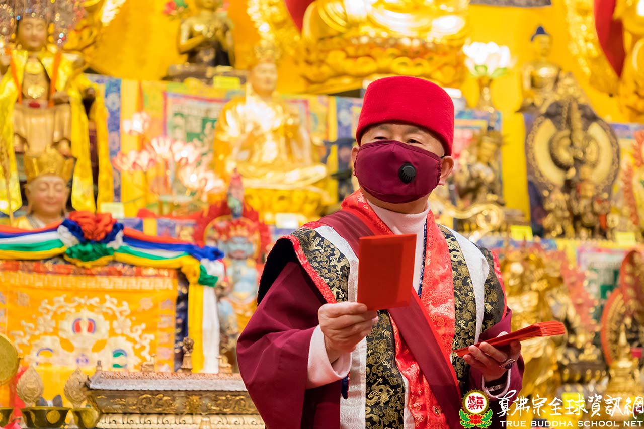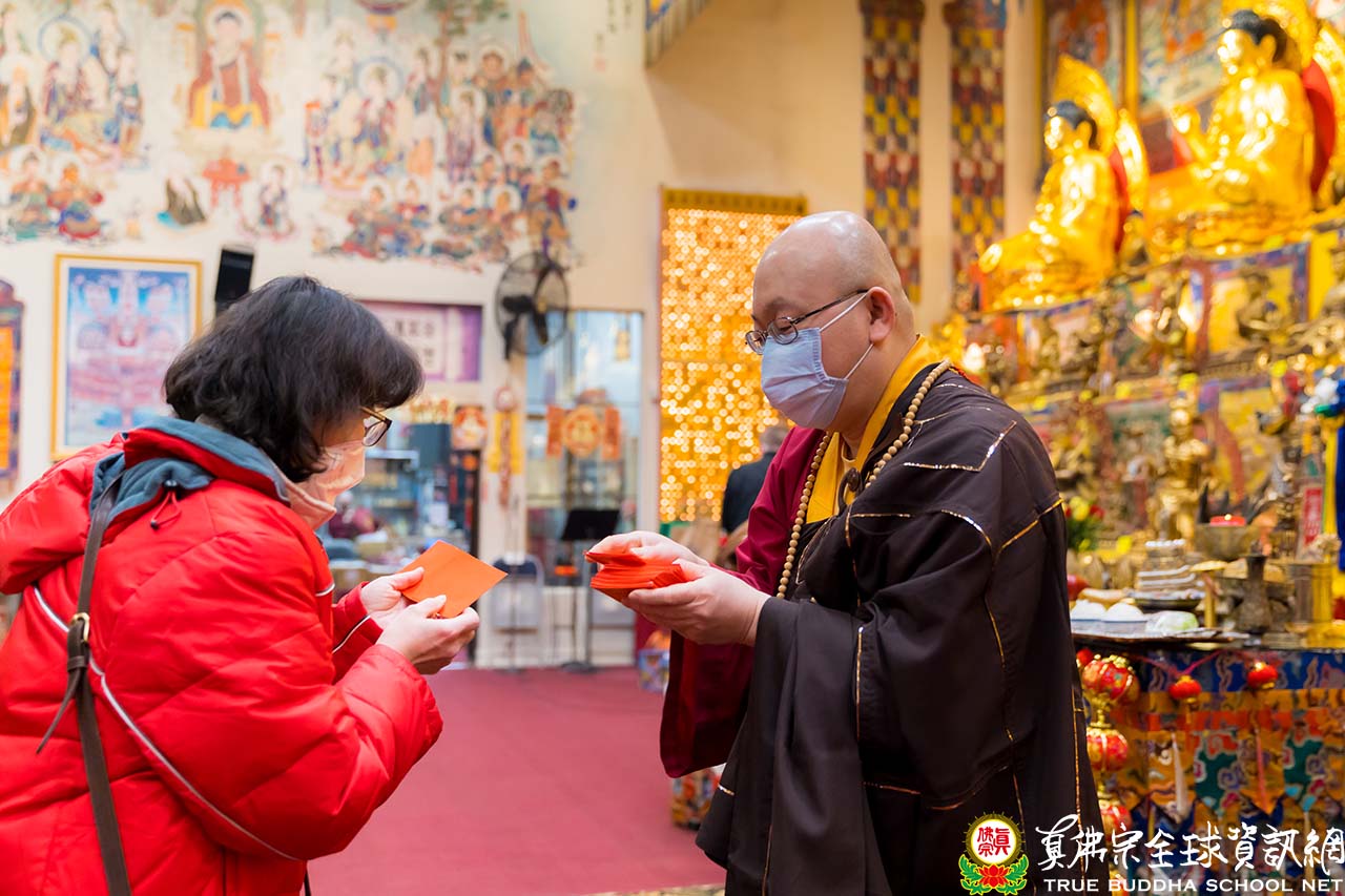 在師尊、師母莊嚴的上香點燈儀式結束後,接下來就是最開心的時候到了。在特別加持了新年紅包後,師尊開始發紅包給大家,弟子們開心的排隊保持安全距離,恭敬的領受師尊給予的賜福。大家熱情的向師尊、師母拜年,師尊、師母也滿臉笑意春風的祝福大家。有了師尊、師母的賜福,相信在未來新的一年,大家都能一切如意圓滿。在每個人都高興的領完紅包後,師尊、師母也準備回家與佛青、佛奇和孫子、孫女一起團圓吃湯圓。