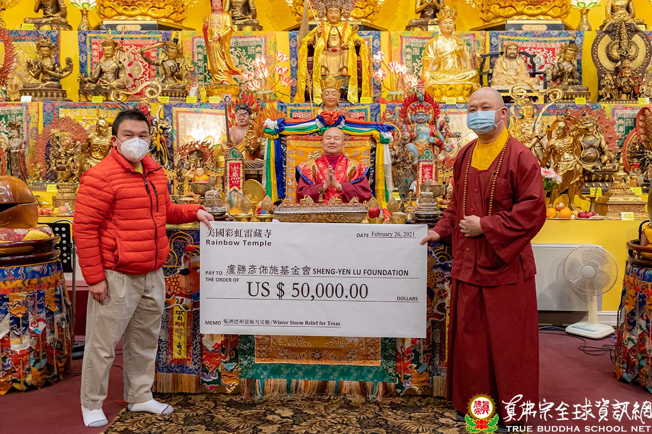 接著,秉持師尊「無緣大慈,同體大悲」的敎導,西雅圖雷藏寺和彩虹雷藏寺各捐贈美金一萬元和五萬元給盧勝彥佈施基金會,以救助德州近日因暴風雪受難的民衆。之後,大家一同觀看一段眞佛般若藏的影片:師尊講述達摩祖師閉關中,可以聽見螞蟻吵架,可見心靜的程度。般若藏也以師尊的畫--岩洞行者來作為師尊新書的封面。這本師尊新書,是蓮生活佛文集第282冊,書名是【遇見達摩祖師】,將於三月四日全球同步發行。