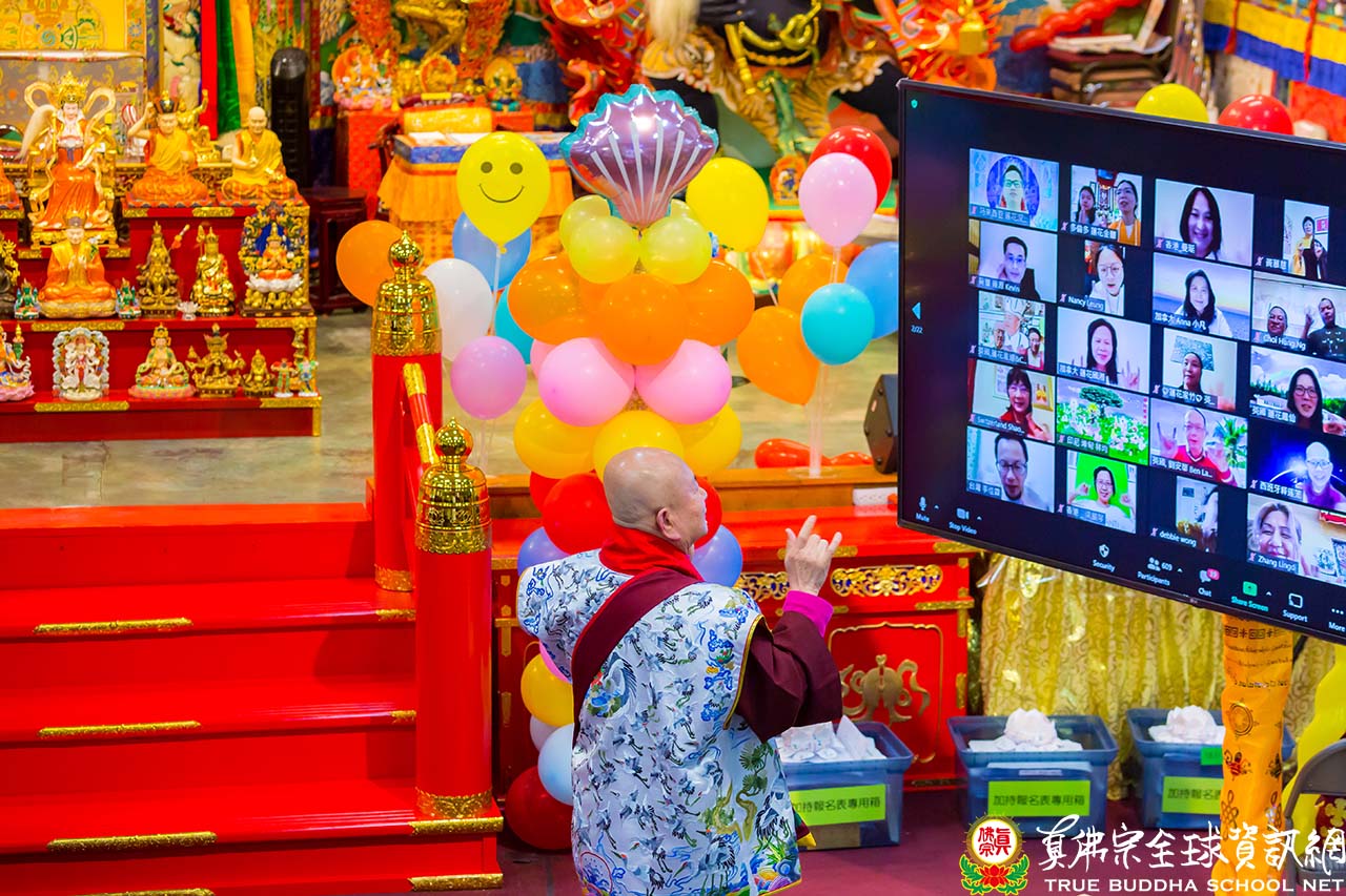 法會後,弟子們慶祝蓮生法王出家三十五週年紀念,法王許願弟子們能身體健康、道心堅固、修行成就。慶祝活動後,法王移駕到Zoom前與弟子們互動,弟子們熱情表達對法王的祝福與想念,法王隨後慈悲加持現場及網路上的所有弟子,並觀賞當天弟子們供養的演出,留下一段美好的回憶。