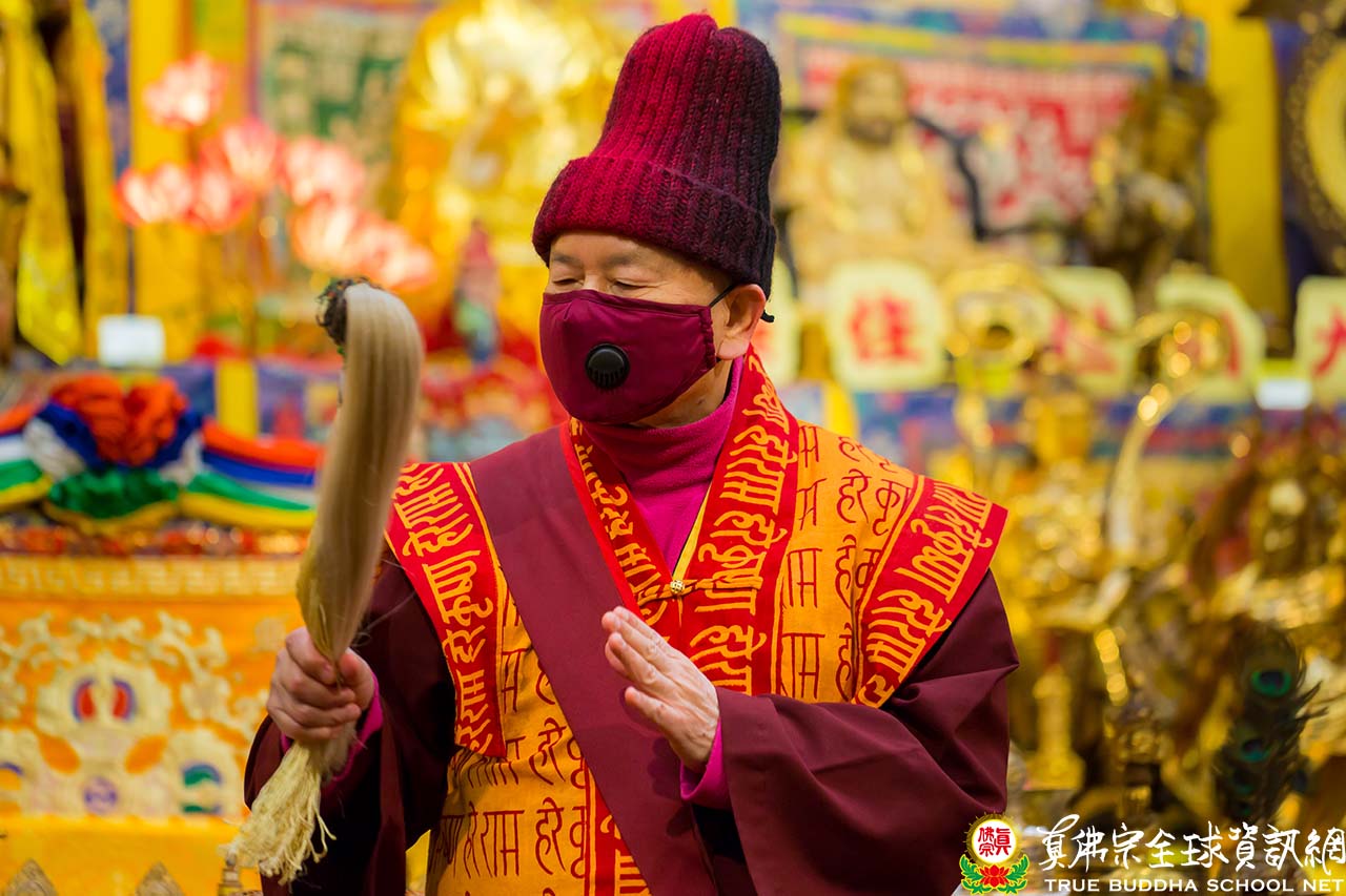 在聖尊精妙絕倫的開示後,聖尊加持大眾並加持大悲咒水和為佛像開光。祖廟特別準備了大蛋糕為慶賀聖尊的出家紀念日,大家開心的唱歌祝賀。最後,聖尊慈悲以拂塵為大家加持賜福。