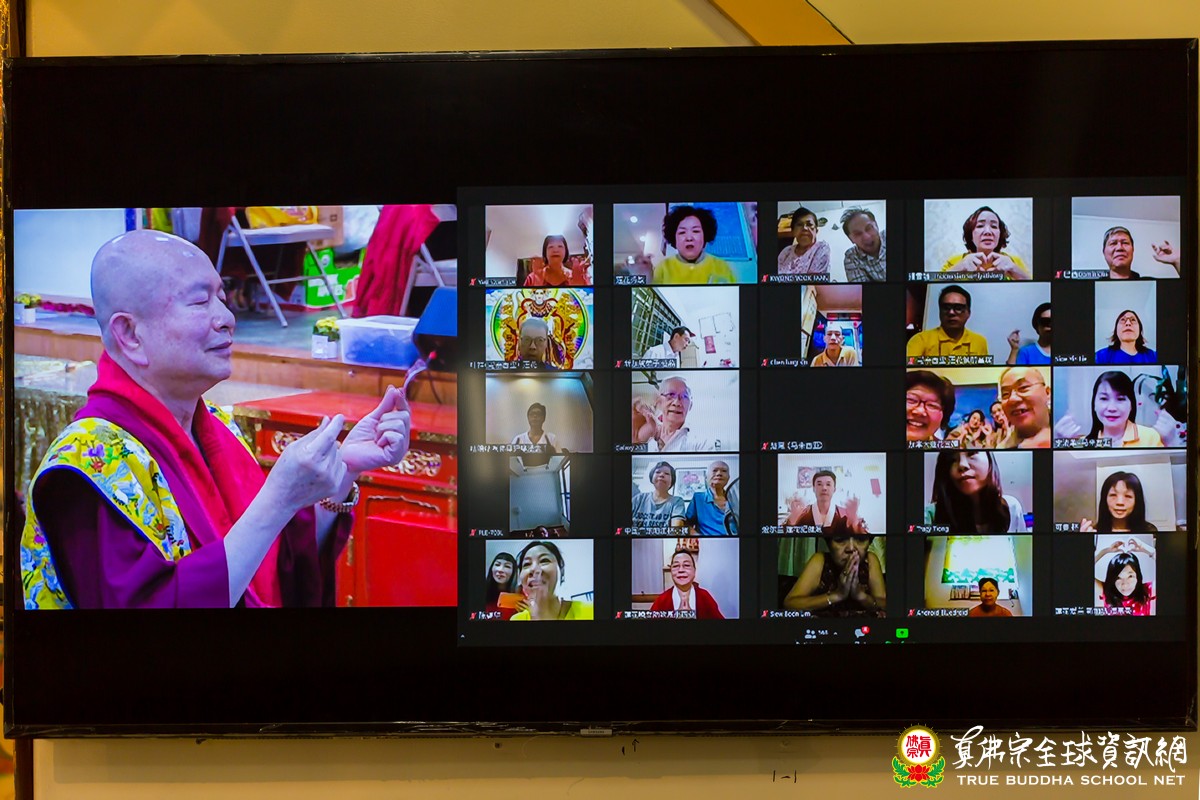 開示完畢後,現場邀請師母一同慶祝母親節。隨即,【魯冰花】及【世上只有媽媽好】的歌曲響起,師母緩緩步向蛋糕前,臉上洋溢著歡喜和悅的笑容。師母一生盡心盡力護持宗派,讓法王弘法路上無後顧之憂,幫助眾生慧命增長,實乃真佛宗之偉大母親。師母先獻花於法王,代表眾生感謝法王賜予慧命;然後法王獻花於師母,感謝師母無怨無悔為宗派全力付出。接著,師母俏皮地與法王合照,再一同與Zoom上弟子道別,法會在和樂溫馨的氛圍下,拉下帷幕。