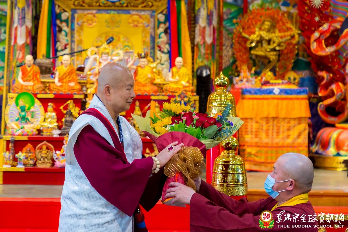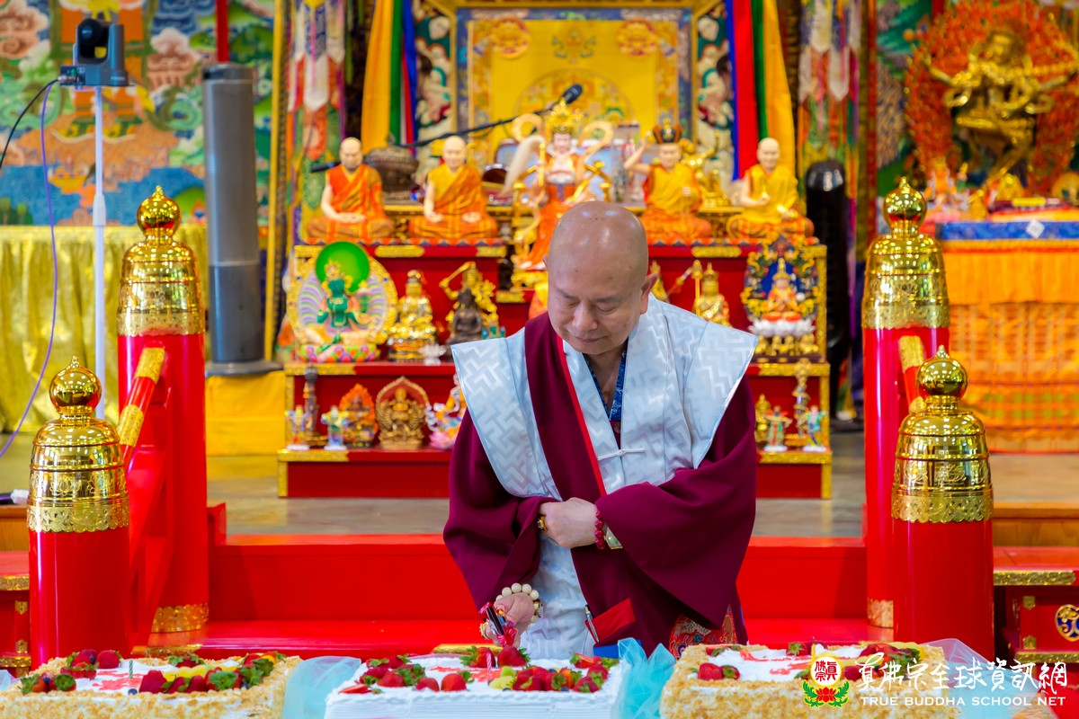 開示已畢,眾弟子齊唱「父親節快樂」歌祝賀真佛宗偉大的慈父蓮生法王父親節快樂,並請法王吹蠟燭及切蛋糕。zoom上眾弟子也紛紛祝賀法王。接著法王賜授在場弟子無上珍貴的蓮花童子法灌頂,法會吉祥圓滿。