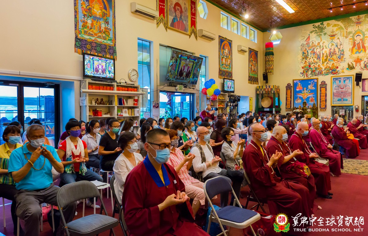 西雅圖雷藏寺在六月二十六日星期六先為師尊暖壽,大殿內佈滿了彩色氣球、壽桃、壽包、壽麵、鮮花、水果,琳琅滿目的供品堆滿了整個壇城,張燈結彩,喜氣洋洋。各地遠道來慶生的同門,都遵守防疫的規則,西雅圖雷藏寺也特別準備了愛心便當,讓大家方便用餐。在這人天同慶的大喜日子裏,老天爺也不落人後,給了我們破紀錄的炎炎夏日的高溫,好似作為大禮物送給師尊慶生,堪比同門對師尊的熱情!