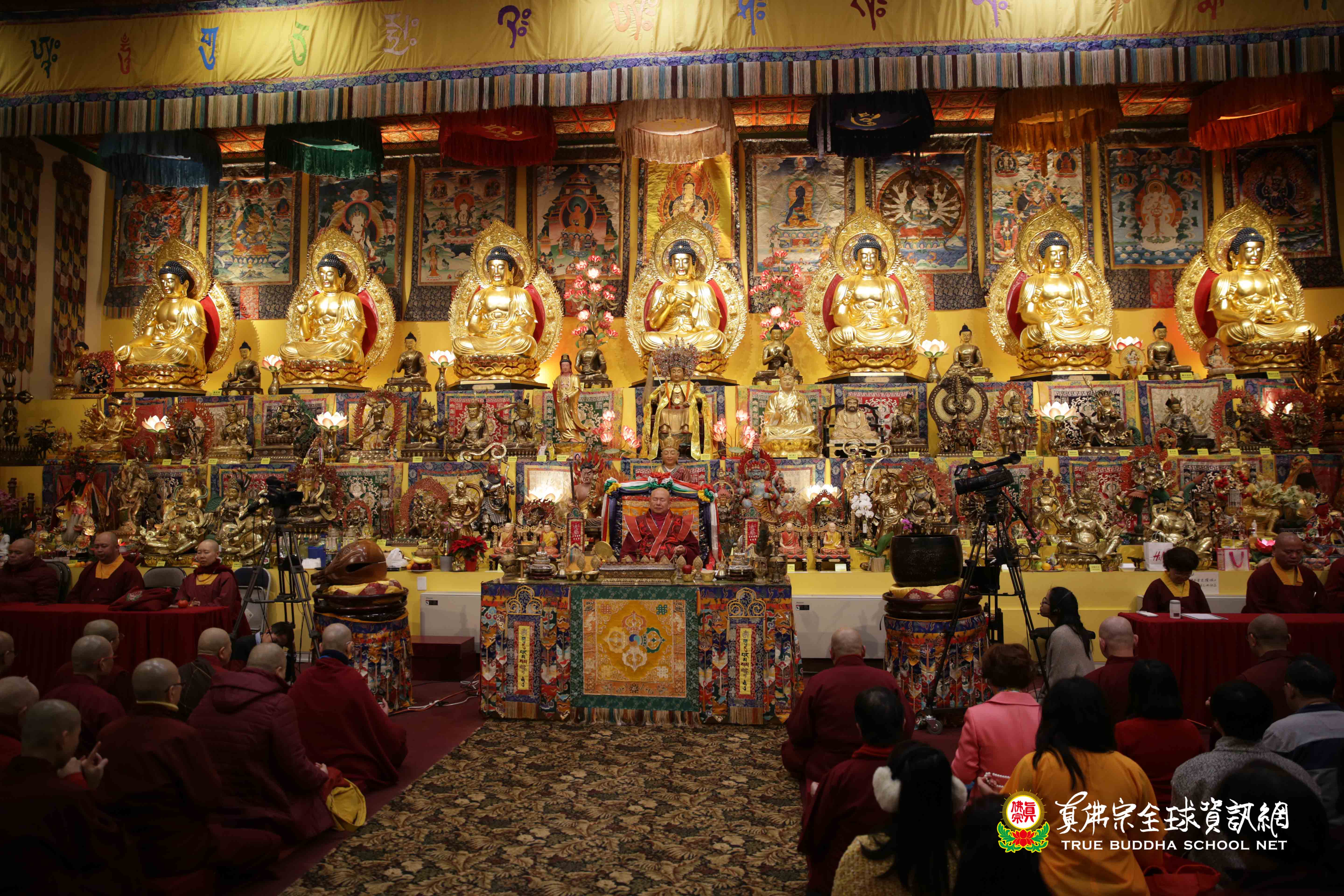 蓮華生大士最有名的有五個佛母,曼達拉娃(印度)、依喜措嘉(西藏)、卡拉悉地(尼泊爾)、釋迦爹娃、她希。西雅圖新春法會將首傳的依喜措嘉佛母,是西藏的第一大佛母,藏地的第一大佛母是蓮師的道伴。依喜措嘉是妙音天女的轉化,妙音天女在天上與吉祥天女是姐妹,師母就是吉祥天。蓮華生大士在西藏弘法五十年,祂與藏王赤松德真王、寂護大師,在靠近雅魯藏布江的地方建立了西藏第一座寺廟桑耶寺。蓮師把祂修行的心要口訣,放到赤松德真王的腦海裡。而今天的盧師尊同樣的在腦海裡有伏藏,就是蓮師將伏藏放在師尊的腦海裡面。其中有一個秘密就是,蓮師在西藏轉世成卓米譯師,卓米譯師就是蓮師的轉化。卓米譯師到印度的超戒寺學法,他取回了薩迦教最大的法「道果」,回到了西藏,他本身得到畢瓦巴最大的加持和傳承。聖尊今天能講道果,就是因為卓米譯師就是蓮師的轉世。蓮師最擅長的就是大圓滿九次第的法,聖尊跟隨蓮師,知道了最高的阿底瑜伽,阿底瑜伽最重要的一個是「止」(止斷)、一個是「超」(頓超),超越了生起次第、超越人間。所以聖尊與蓮師的根源非常的深,祂的一個秘密傳承是來自於蓮華生大士。聖尊曾被蓮師帶到岩洞做了兩個灌頂,一個灌頂是蓮師顯現百寶光明,光明從每一個毛細孔進到聖尊的身體裡。第二個灌頂是從口進入身體,在從密輪出來,這都是在禪定當中所產生出來的,非常不簡單。