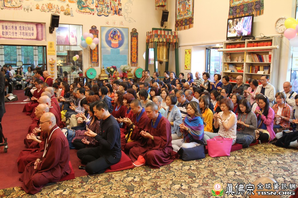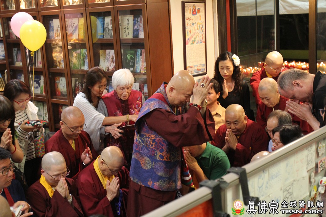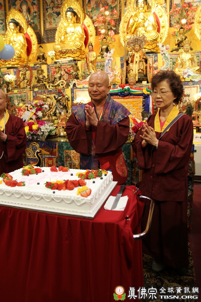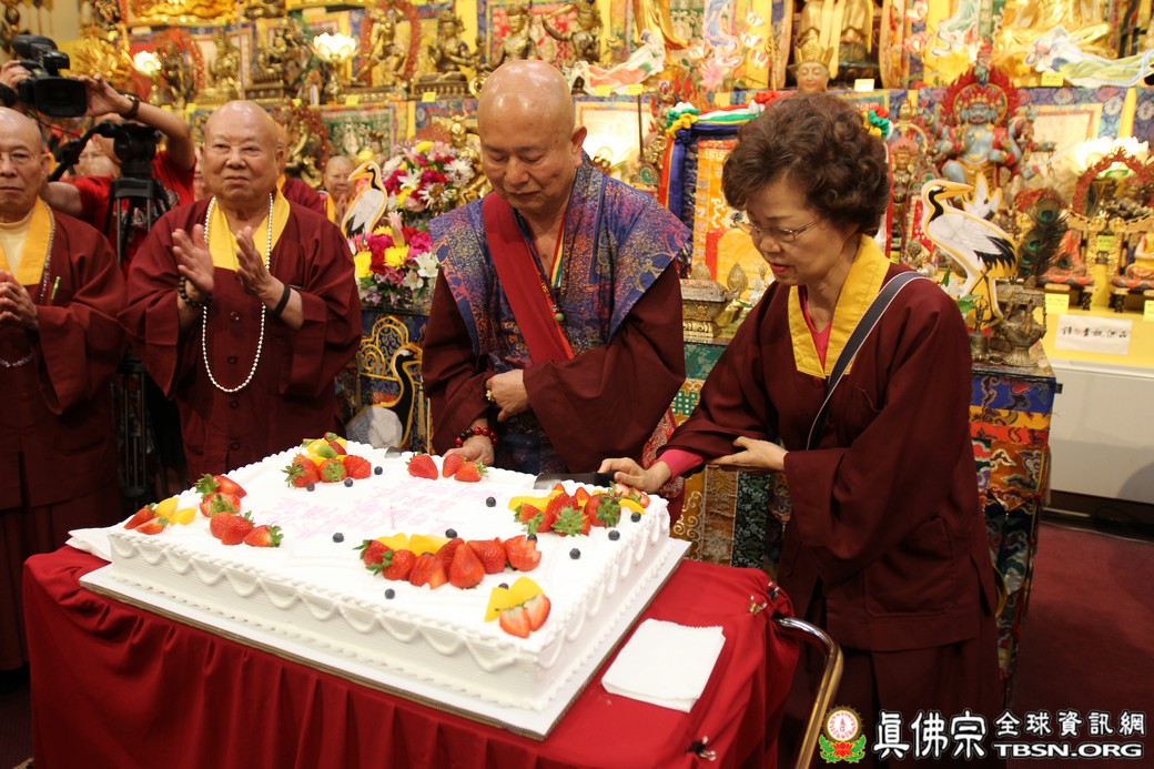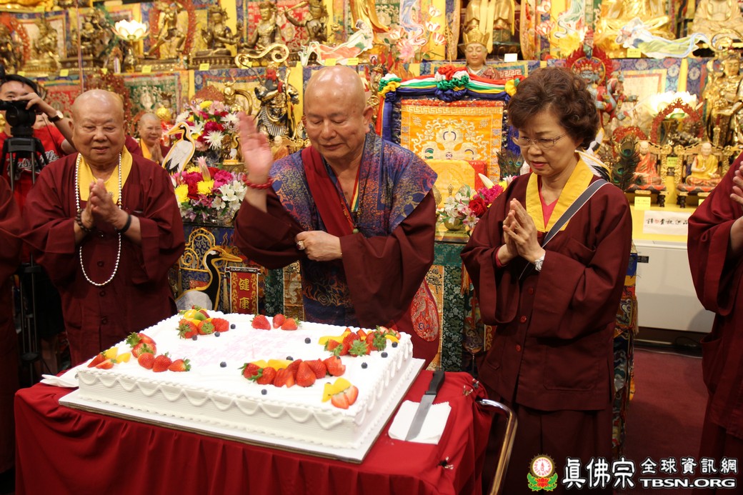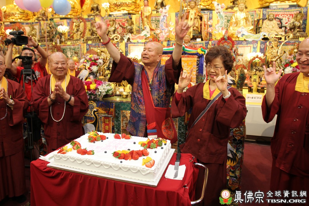 在精闢的開示後,雷藏寺唱誦組帶領大眾唱誦阿彌陀佛聖號。會後,聖尊為求皈依的信眾賜受灌頂,並加持大悲咒水、開光佛像。最後祖廟推出大型的生日蛋糕慶賀聖尊的生日,大家一遍又一遍的齊聲歡唱不同語言的生日快樂歌,聖尊與師母一起切蛋糕,滿堂的掌聲、喝采聲不絕於耳,無論是現場或是收看網路直播的同門,全世界的弟子都誠心的對根本上師獻上滿滿的祝福。