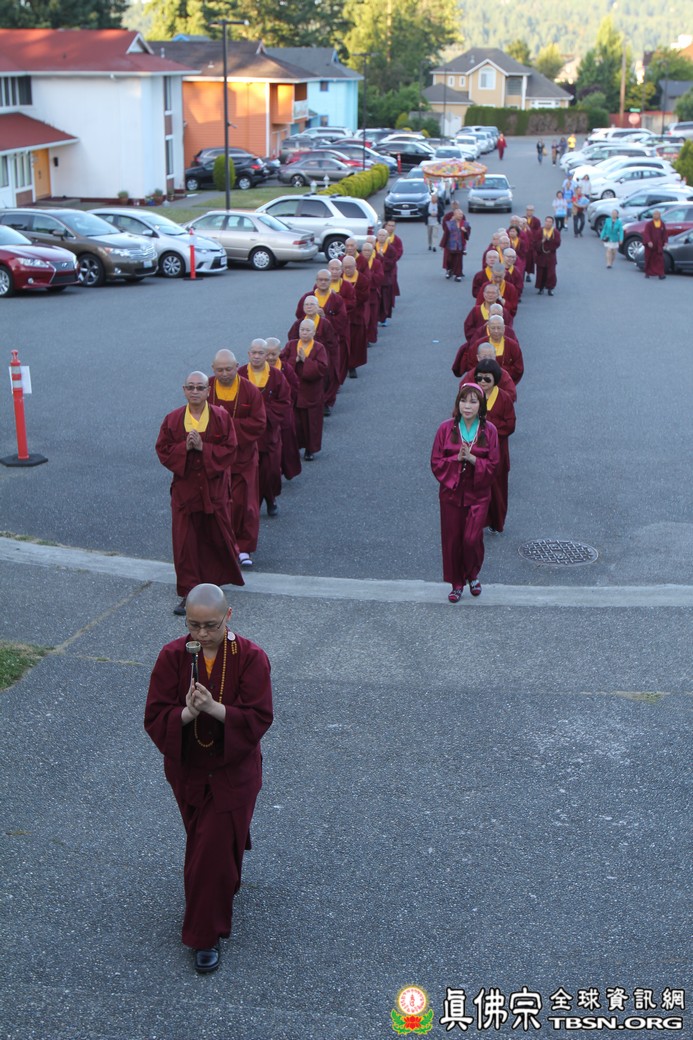 長長莊嚴的迎師隊伍,虔誠迎請聖尊蒞臨主壇當晚的同修會。在莊嚴肅穆的同修後,聖尊特別提到有很多的同門和貴賓從很多國家、很遠的地方,都來到了祖廟西雅圖雷藏寺,祂表示很高興看到大家。聖尊更提到晚上同修時來的佛菩薩非常多,是平常的三、四倍,整個虛空之中,降下了許多的般若光。今天同修藥師琉璃光如來的時候,藥師佛跟祂所有一切的眷屬,全部下降加持大眾。