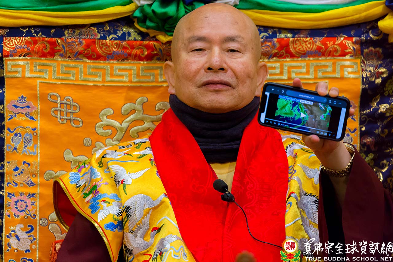 在殊勝圓滿的修法結束後,聖尊首先談到真實的感應事跡,上星期加州四大媽為了加州的旱災跟森林大火,特別來到西雅圖雷藏寺向龍王祈求,一共求了六天。瑤池金母有指示,就是由我們今天同修的本尊黃財神(多聞天王的化身)、持國天王、增長天王、廣目天王,護世四天王跟著龍王亭的龍王,南下到California。衛星雲圖中厚厚的雲層一直往加州那邊移,天氣預報明天開始下雨,加州會連續下一個禮拜的雨!祖廟的龍王非常靈感!四天王非常靈感!緣分就是這樣子,她們四人合起來是有力量!