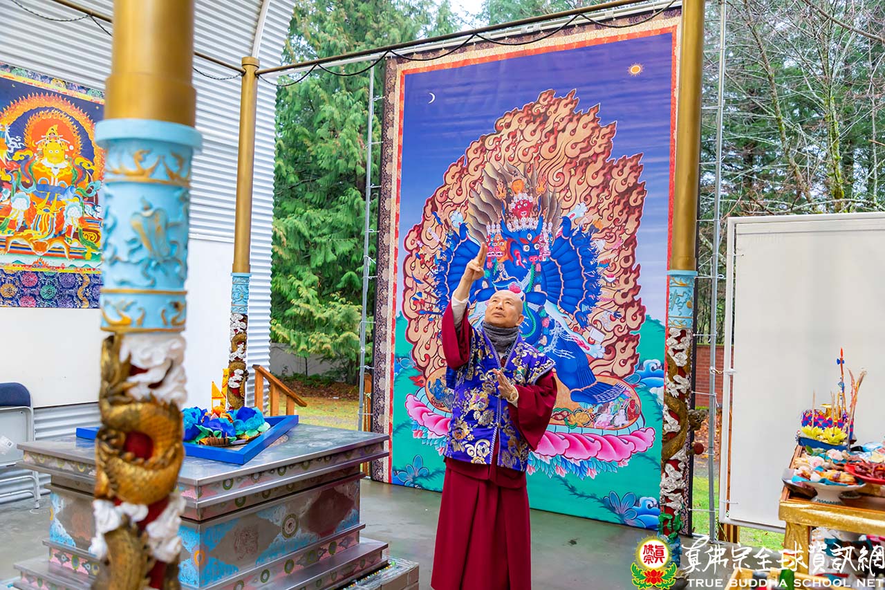法王回憶,當初在西雅圖雷藏寺傳授『大威德金剛法』時,風雨交加,甚至將帳篷都壓垮;而如今的法會,也是大雨滂沱,顯示大威德金剛的威力無窮,此尊是彩虹雷藏寺金剛明王殿的主尊,也是法王主要的護法。法王說,當祂與大威德金剛相應時,法王在禪定中下降到了海底,而大威德金剛也下降到了海底,頓時海底出火,海水翻滾,大威德的力量非常偉大。東密認爲,大威德金剛是阿彌陀佛的化身,藏密則認爲是文殊菩薩的化身,這三尊是同屬一個系列。