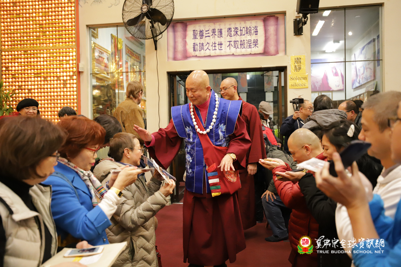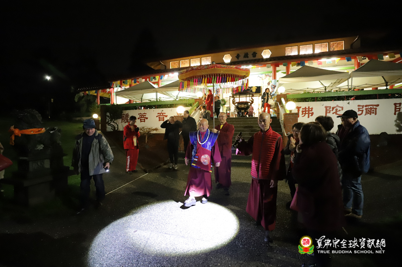 開示結束後,聖尊為大眾賜授皈依灌頂、加持大悲咒水和開光佛像,臨行前還慈悲一一為每位善信摩頂加持所求如願。步出廟外,迎著細細的雨絲,與聖尊走在同一個夜空下,呼吸同樣的空氣,感覺清淨美好的幸福,一心頂禮大恩根本傳承上師。