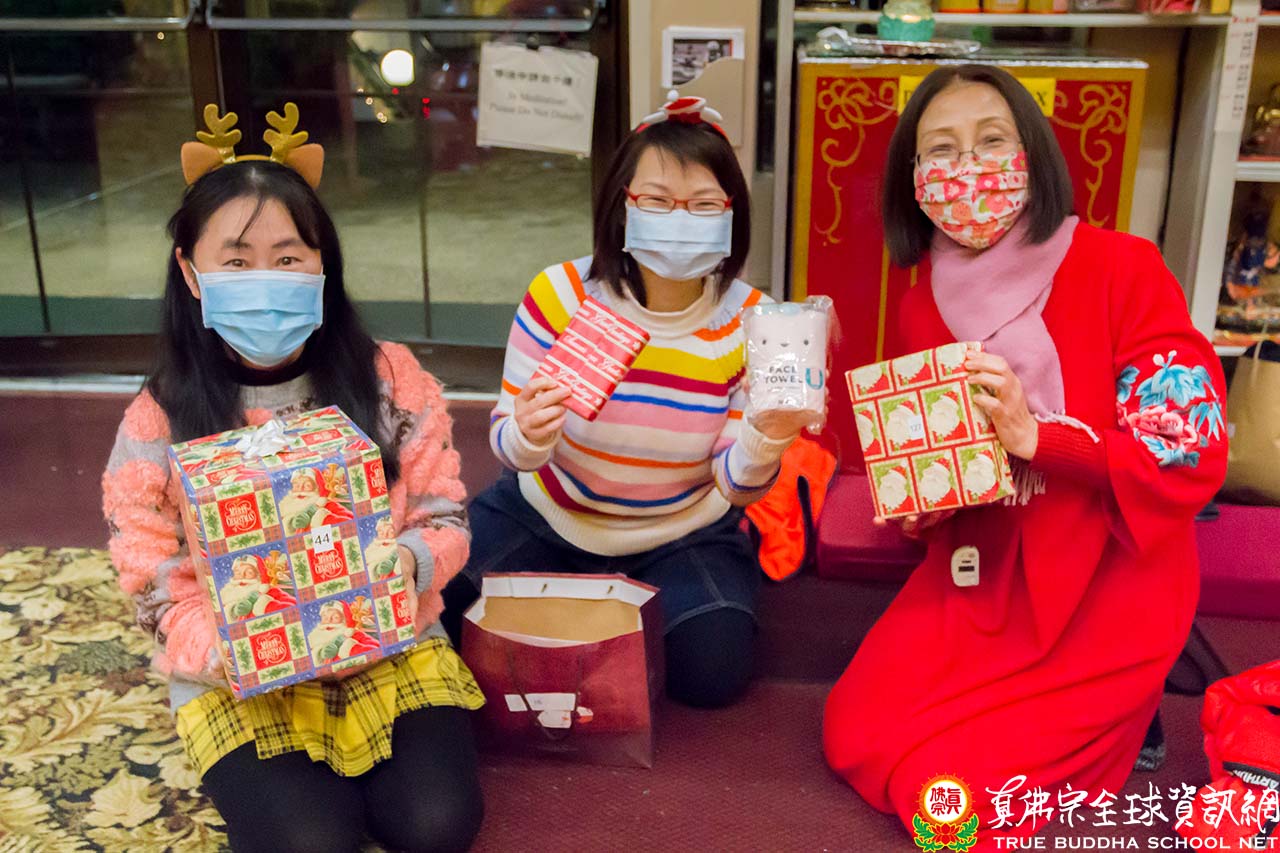 接下來的重頭戲是交換禮物,大家轉移陣地到大殿,大殿內的聖誕樹下已擺滿了聖誕禮物,經由工作人員把包裝精美的禮物編號,以便大家領取。每一個人都希望能抽到(1)號是師佛贈送的禮物,或(2)號是師母捐贈的禮物。