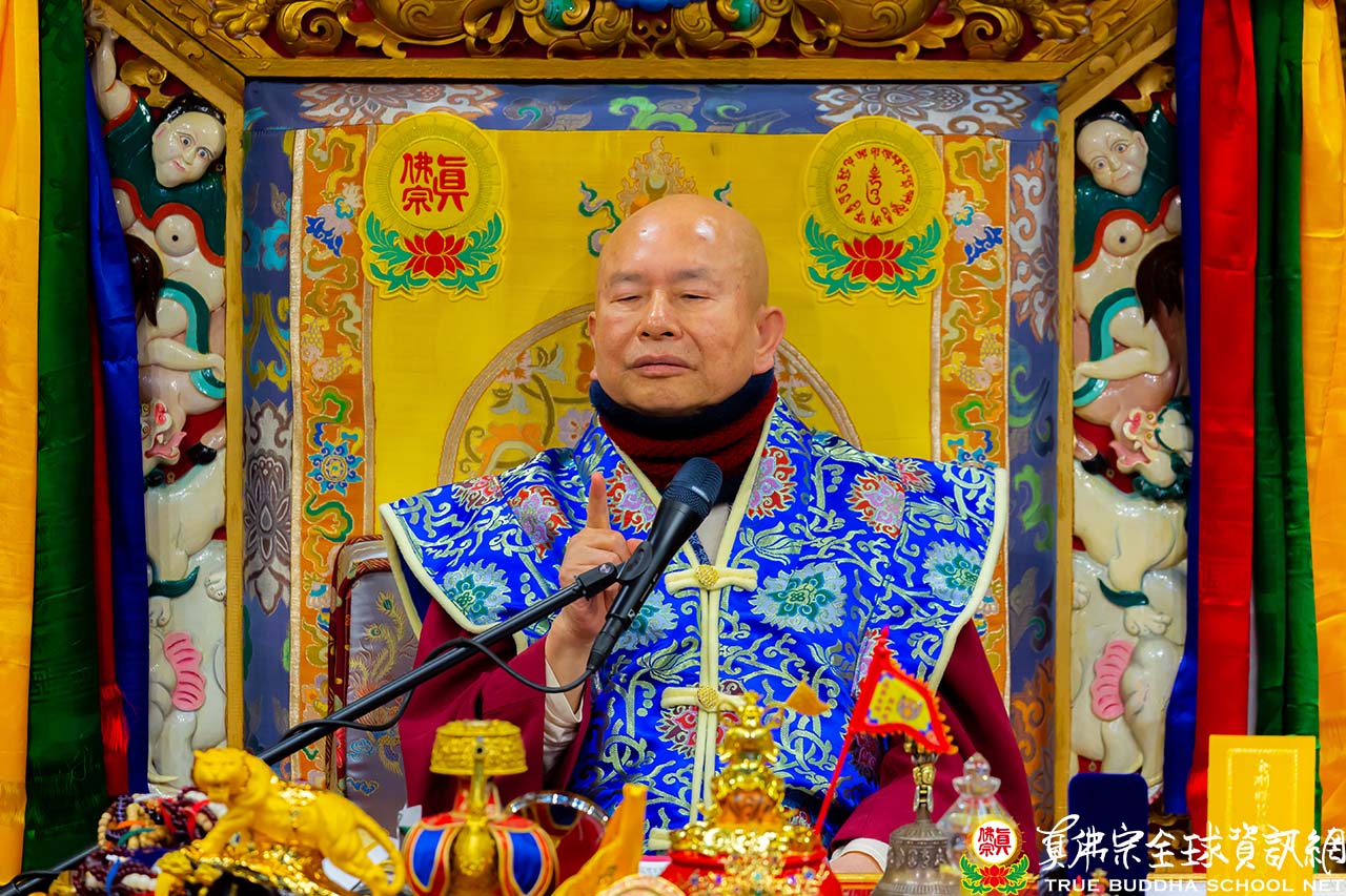 接著,法王講解虎年的吉祥物——虎頭金剛。法王親誦虎頭金剛的咒音「嗡。金母。悉地。吽。吽。呸。」,強調咒中的「呸」字雖沒在金剛經中提到,但帶有「斷掉」的意思,可斷掉一切煞及停止一切念頭,如真佛經中提到「以無念為正覺佛寶」。而【地藏經】更提到「南閻浮提眾生,舉止動念,無不是業,無不是罪」,意味著人的念頭就像瀑布與海浪,一波接一波,永不止息。尤其是靜坐時,可以感受到雜念不止。為什麼會有雜念呢?因為它從來沒有停止過,而「呸」就是停止一切念頭。只有達到無念時,宇宙意識的法流才能融合、相通,達到成就。法王祝福大家把不好的斷掉,而善的、財神到你家。