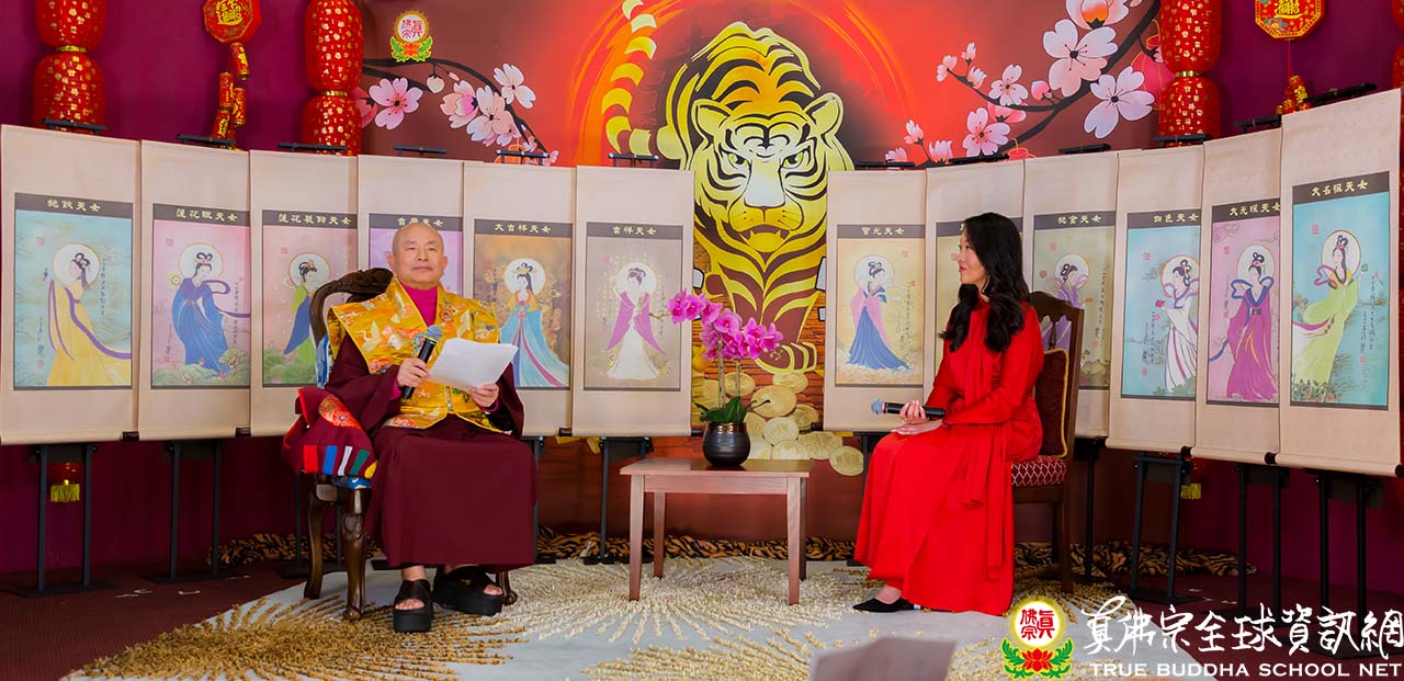 「我們都知道蓮生活佛—盧勝彥,是一位集智慧與才藝於一身的作家。目前已經出版了兩百八十六冊的盧勝彥文集之外,也是一位將藝術、心靈、佛法完美融合,造詣極高的書畫家。盧師尊從不間斷地天天寫作、畫畫精進,更是為世人所稱道。在蓮生活佛的書畫創作中,有山水、有近物寫生、有花鳥走獸、有抽象、有人物,更有許多佛菩薩、阿羅漢,與天女的創作。創作的體裁可以說是包羅萬象,令人目不暇給,讚嘆不已。新的一年大家都希望有喜慶吉祥的開始,今天蓮生活佛特帶來應景的創作,與現場及電視機前的觀眾朋友們分享,這是活佛創作的十二吉祥天女圖。可以請蓮生活佛為我們介紹,為何選這套畫作與觀眾分享嗎?」