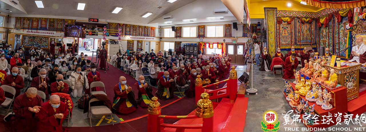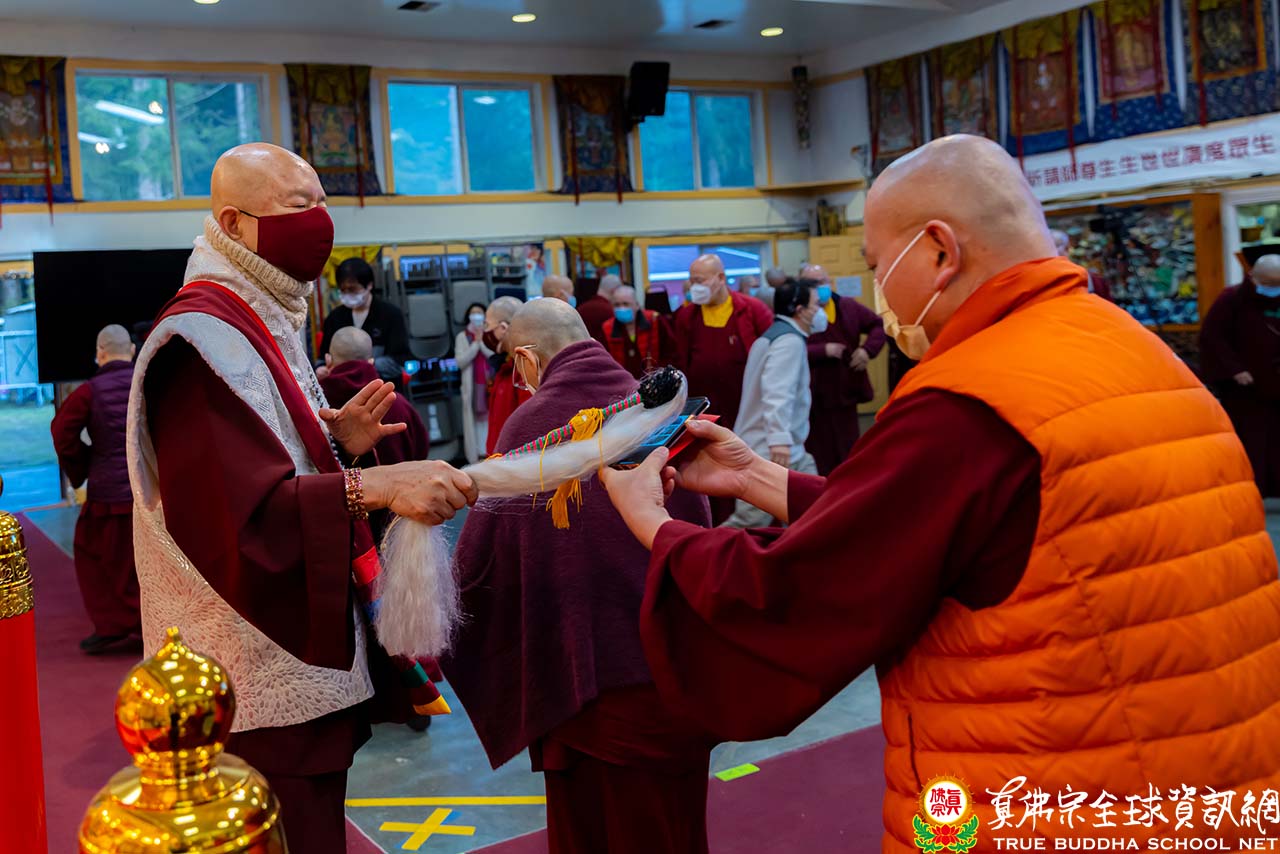 護摩結束後,請佛住世的點燈儀式開始,由宗委會、彩虹雷藏寺、西雅圖雷藏寺代表敬獻哈達及供養以表最崇高的敬意,全體弟子長跪合掌,司儀以動人的聲音說出了弟子們的心聲:法王是明燈照亮了世間、照亮了弟子們的慧命,是世間最溫暖慈悲的撫慰,是夜空中最明亮的星,指引眾生開悟得解脫。法王的大日光明點亮了弟子們心裡的那一盞燈,弟子們願以一己的螢燭之光,齊聚成為皓月之明,祈願這希望的光明能照見弟子們再三的請佛住世之心。