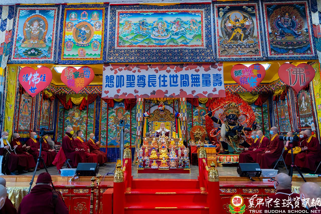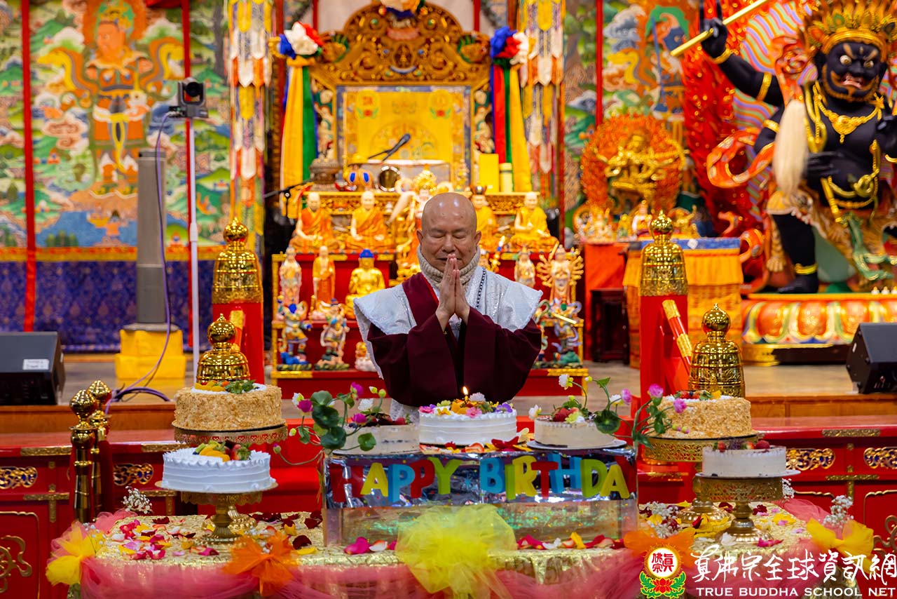 法會後,彩虹雷藏寺為法王準備了精美的蛋糕慶祝這個美好的日子,彩虹雷藏寺代表也獻上了美麗的鮮花及供養。之後大家又以一曲「感恩師尊」用手語的表達來呈現對聖尊的感恩。這首歌深深的打動了法王以及現場及網路、zoom線上的所有弟子,大家沉浸在這幸福的氣氛中留下了感動的淚水。儘管弟子們都在努力的學習「過去心不可得,現在心不可得,未來心不可得」,但還是祈願此時此刻的美好,留在弟子們的記憶中天長地久。最後,法王為現場的弟子們做了蓮花童子灌頂,法會在無限的感動及喜悅中圓滿落幕。