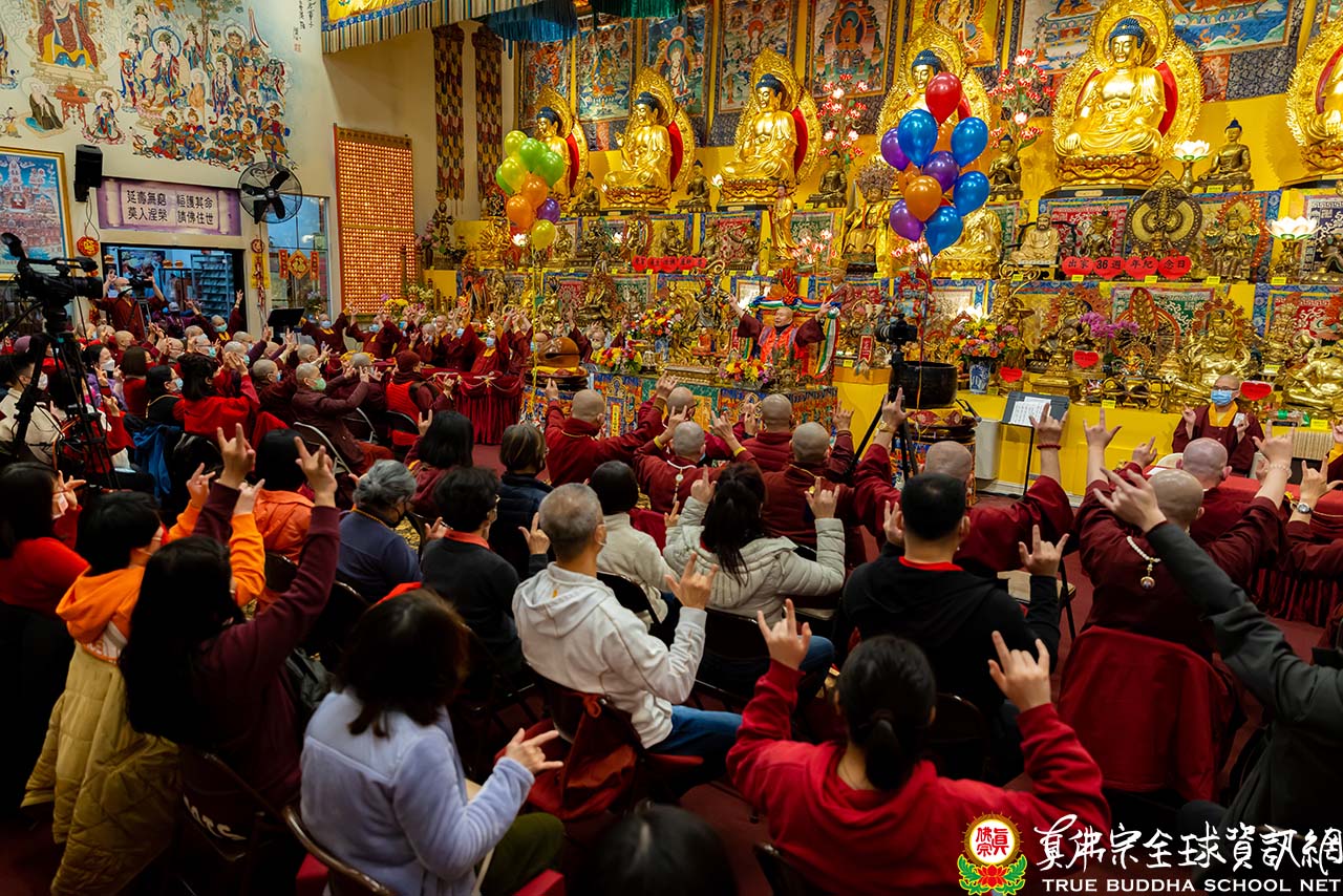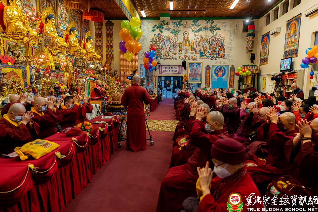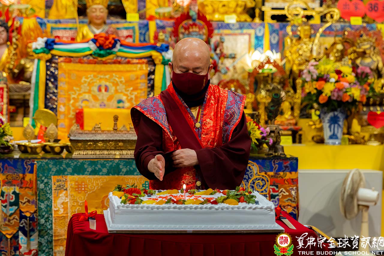 聖尊彌足珍貴的金剛經講釋結束後,慈悲為新皈依弟子做皈依灌頂,並加持大悲咒水、開光佛像、加持眾弟子。祖廟特別準備了大蛋糕慶祝聖尊出家三十六周年紀念,在充滿感恩的祝賀歌聲中,聖尊吹蠟燭、切蛋糕。因為有聖尊的誓願度眾生,才有今天真佛宗的五百萬弟子。祝願聖尊佛體康泰長住世,常樂自在度眾生!