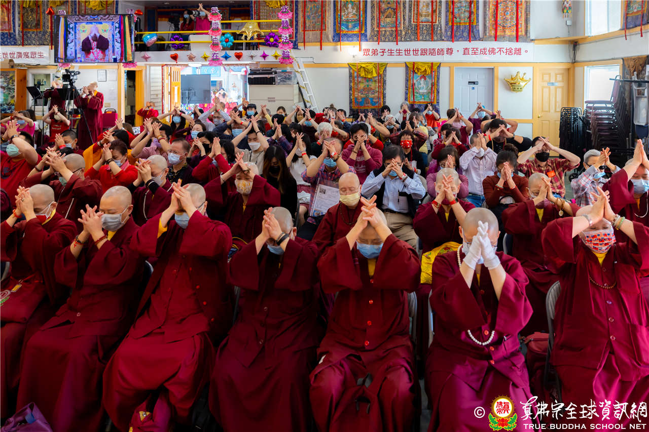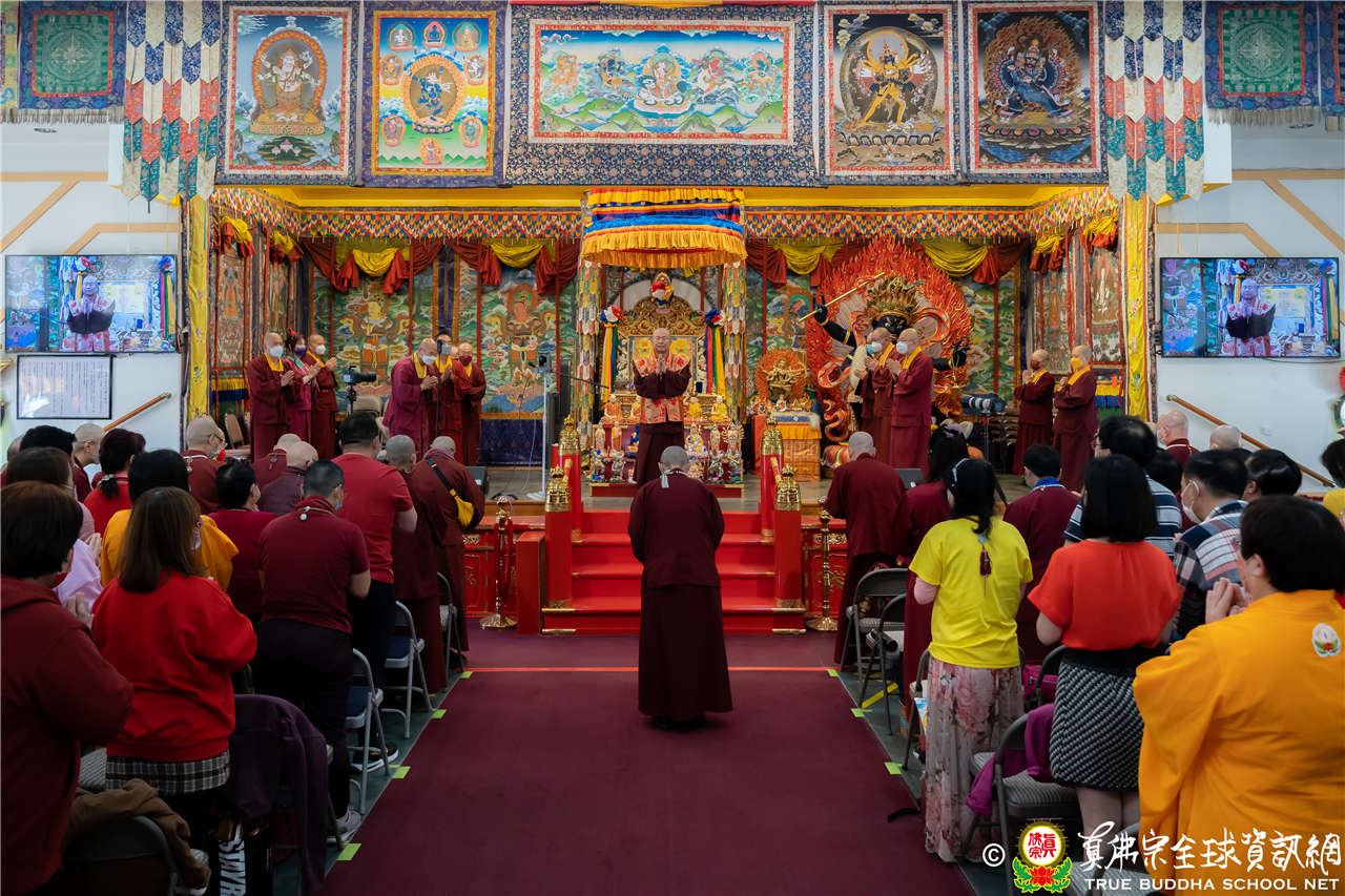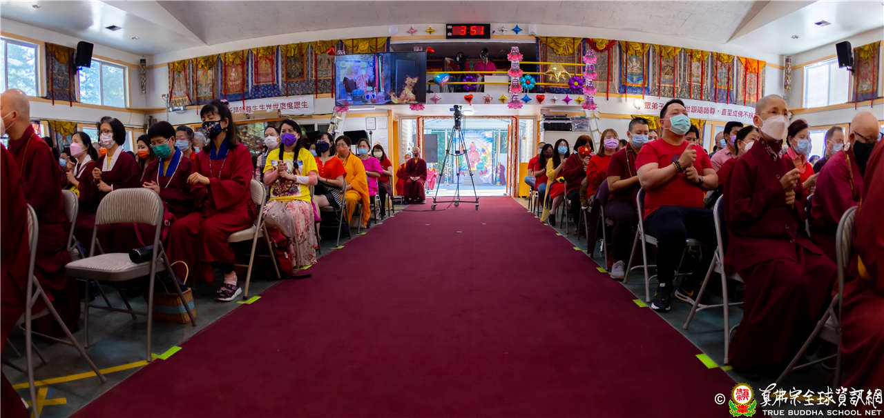 最後法王移駕到Zoom前與弟子們互動,弟子們誠摯地感恩師尊開示,並紛紛在鏡頭前感謝法王,法王慈悲加持祝福現場及網路上所有弟子,現場眾弟子接受法王的「勾財天女」灌頂,法會圓滿結束。