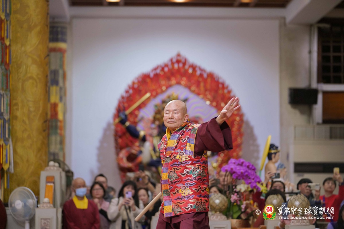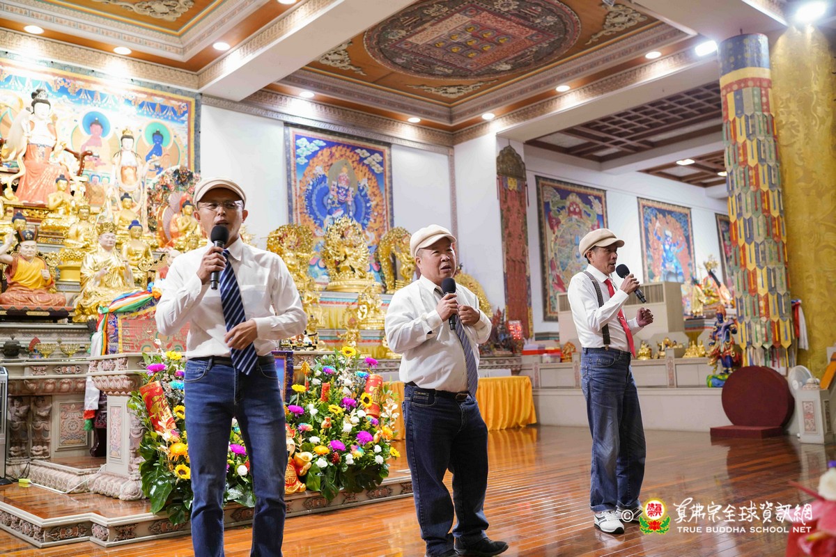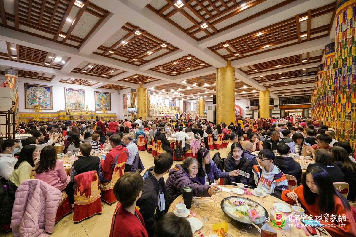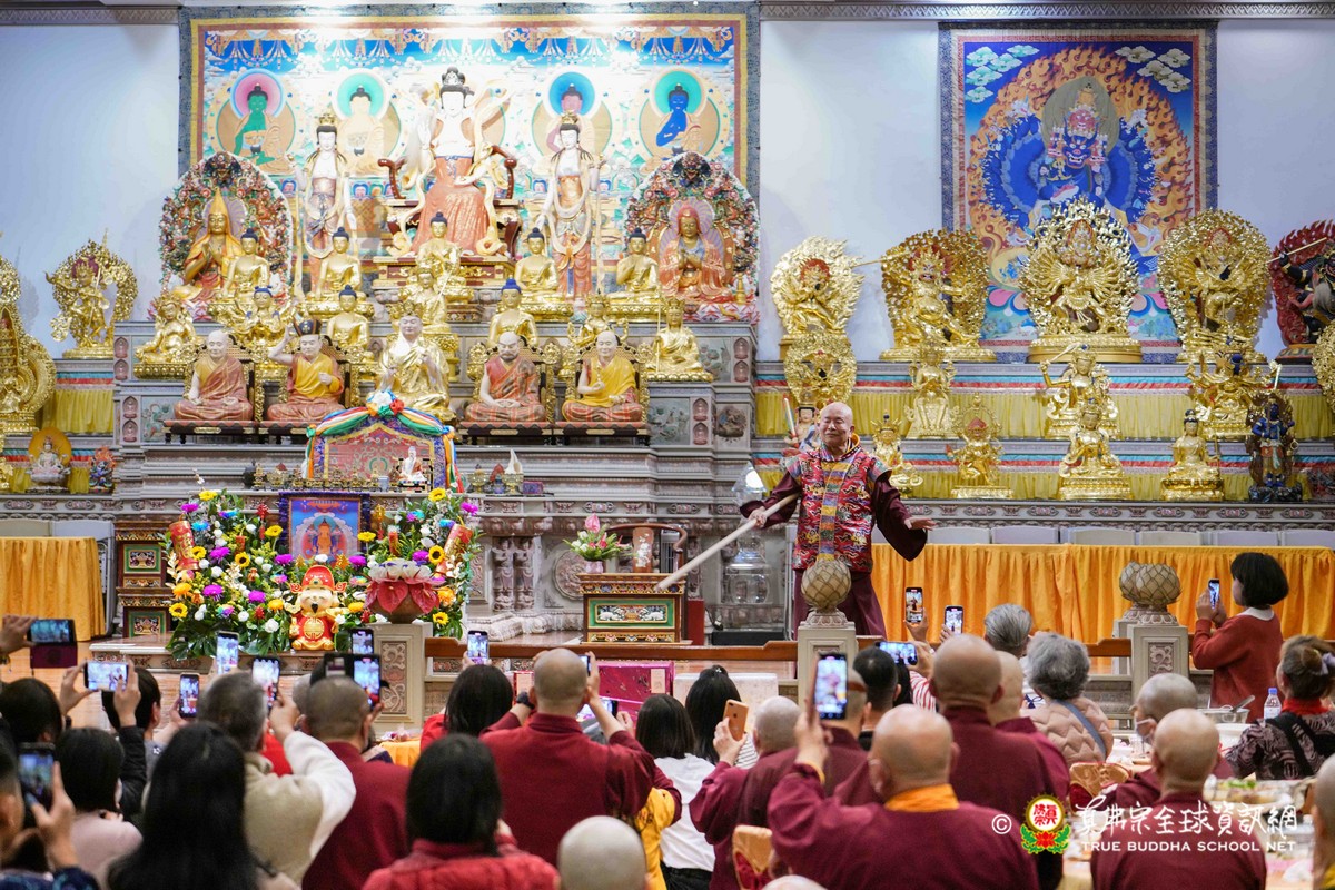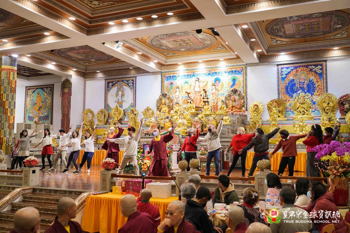 師尊在用餐期間還巡視各桌,也以吉祥鼓、金剛棍表演加持大家!台灣雷藏寺更特別準備精彩的年節之節目,由蓮花素任助教與豆豆師姐主持!現場氣氛非常的溫馨熱烈!