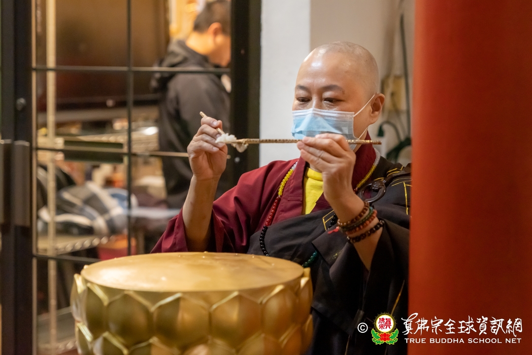 人潮不斷湧入大雄寶殿,全寺幾乎塞滿了上香禮佛的人,大家不怕夜黑,誠心前來西雅圖雷藏寺禮拜諸佛菩薩金剛護法神眾。到了晚上十點半,佛前大供儀式正式開始,丹增加措仁波切和住持蓮吟法師帶領唱誦,蓮明法師敲打鐘鼓,梵聲悠揚,完美地搭配著樂器,眾人很快進入狀態,莊嚴而專注地跟唱佛號佛咒與佛經讚偈,祈求諸佛菩薩加持眾等心想事成。佛前大供結束後,住持蓮吟法師和丹增加措仁波切、眾法師們率先到廟前的香爐上頭柱香,所有大眾滿心歡喜地跟著一同上香,為新的一年祈福許願。最後每個人臉上都掛著滿意的笑容,帶著供品開心地回家,儀式圓滿落幕。有的同門意猶未盡的燃燈供佛,跪在壇城前虔心祈求佛光注照新的一年吉祥如意,有的同門繼續歡聚在一起,留在廟裡跨年夜。法師們不辭辛勞的全天招待香客,一直忙到淩晨兩點才結束。