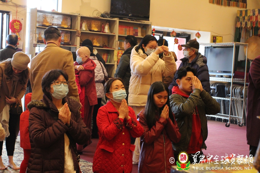 第二天就是大年初一,西雅圖雷藏寺從早上八點整就開門迎接香客前來上香祈福。廟裡繼續播放著節奏明快的新年歌曲,洋溢著開心歡樂的氣氛。這天是彌勒菩薩的誕辰,早上十一點,西雅圖雷藏寺舉行佛前大供,因正好逢到周日,全天人潮絡繹不絕,除夕沒來的人選擇周日過來上香禮佛,西雅圖雷藏寺餐廳還準備了豐盛的午餐和晚餐來招待信徒們,讓每一位信徒感到賓至如歸,開心滿意地回家。法師們盡心招待香客,一直到晚上八點才關門。一連二天長時間的工作,法師們堅守崗位,雖然身體疲倦,仍是親切的服務眾生。